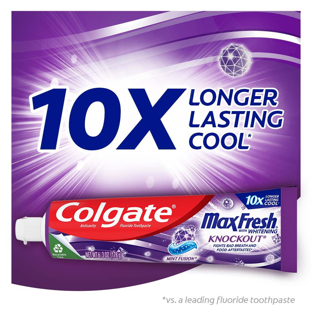 - Three 6.3 Oz tubes of Colgate Max Fresh Knockout with Whitening Toothpaste