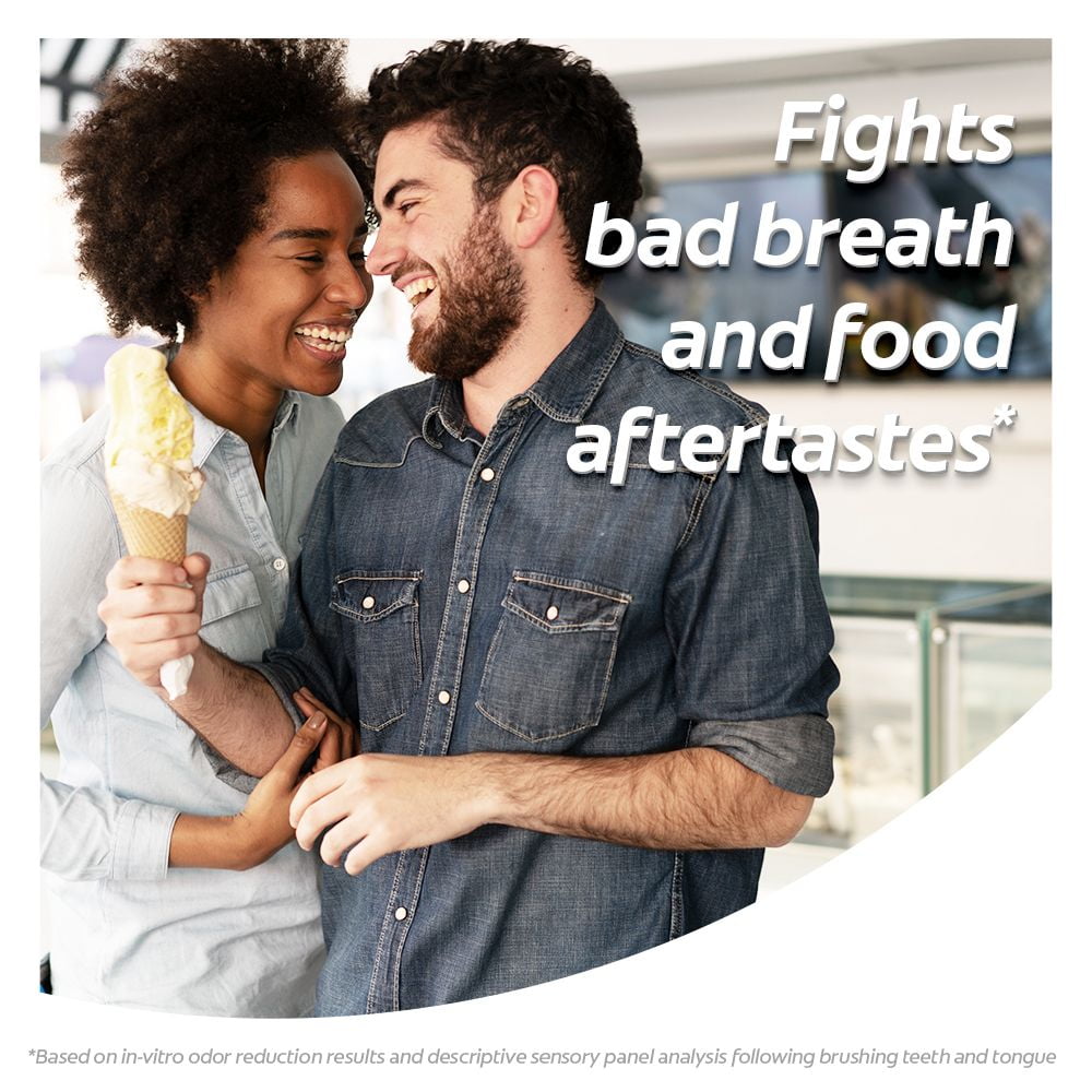 - Helps destroy nasty odors and fight lingering food aftertastes (based on in-vitro odor reduction results and descriptive sensory panel analysis following brushing teeth and tongue)