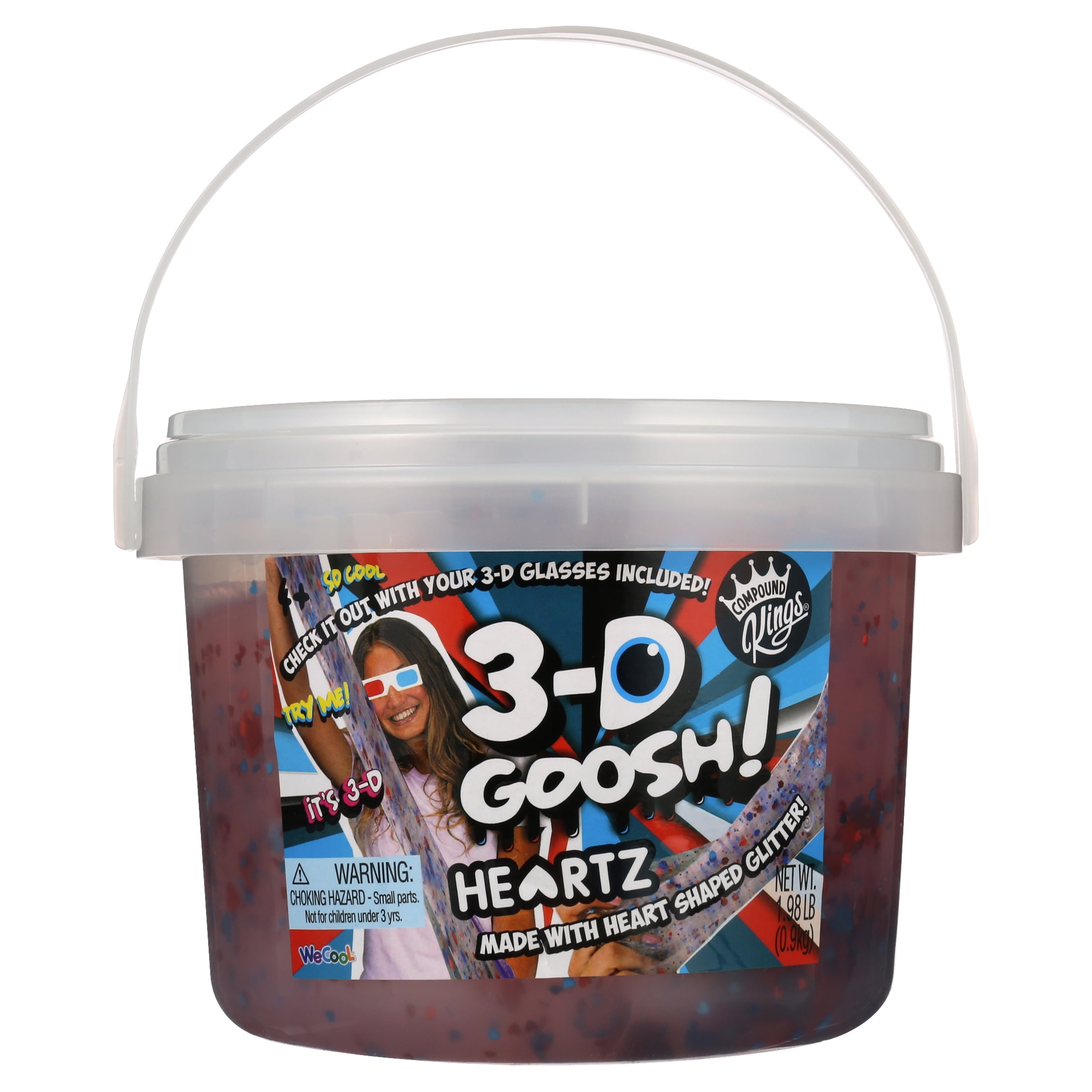 The new 3D Goosh Heartz by Compound Kings will bring your slime to new dimensions like never before! The three-pound bucket of slime will pop and burst right before your eyes! Embellished with flashy glitter hearts and sparkles! Each bucket comes with a pair of REAL 3D GLASSESS designed specifically to bring your 3D Slime to life! Adds a new and fun twist to traditional sliming. 3D Goosh Heartz is available in red & blue.