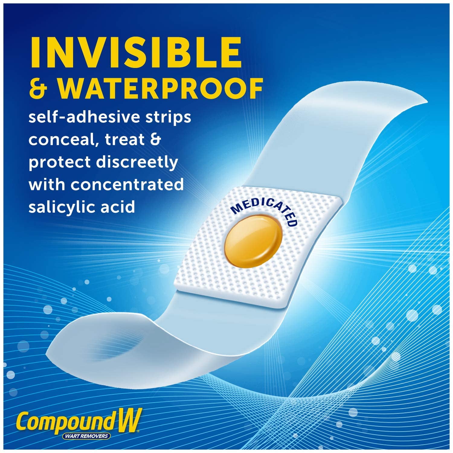 Treat your wart at home! Compound W Maximum Strength One Step Invisible Strips easily, effectively and discreetly remove common and plantar warts. From the Number One most trusted and dermatologist-recommended wart removal brand (1), the cushioned and waterproof self-adhesive strips conceal, treat and protect common and plantar warts comfortably with concentrated salicylic acid. One Step Invisible Strips provide the maximum strength wart remover without a prescription and feature 3-in-1 wart removal protection: treats, cushions and conceals. Safe for use by adults and children 3 years of age or older. (1) National Consumer Panel 52 Week Data: 1/28/2018, 1/27/2019, 1/26/2020 and IQVIA Claim Substantiation Validation Statement, 12/11/18 – 11/30/19.
