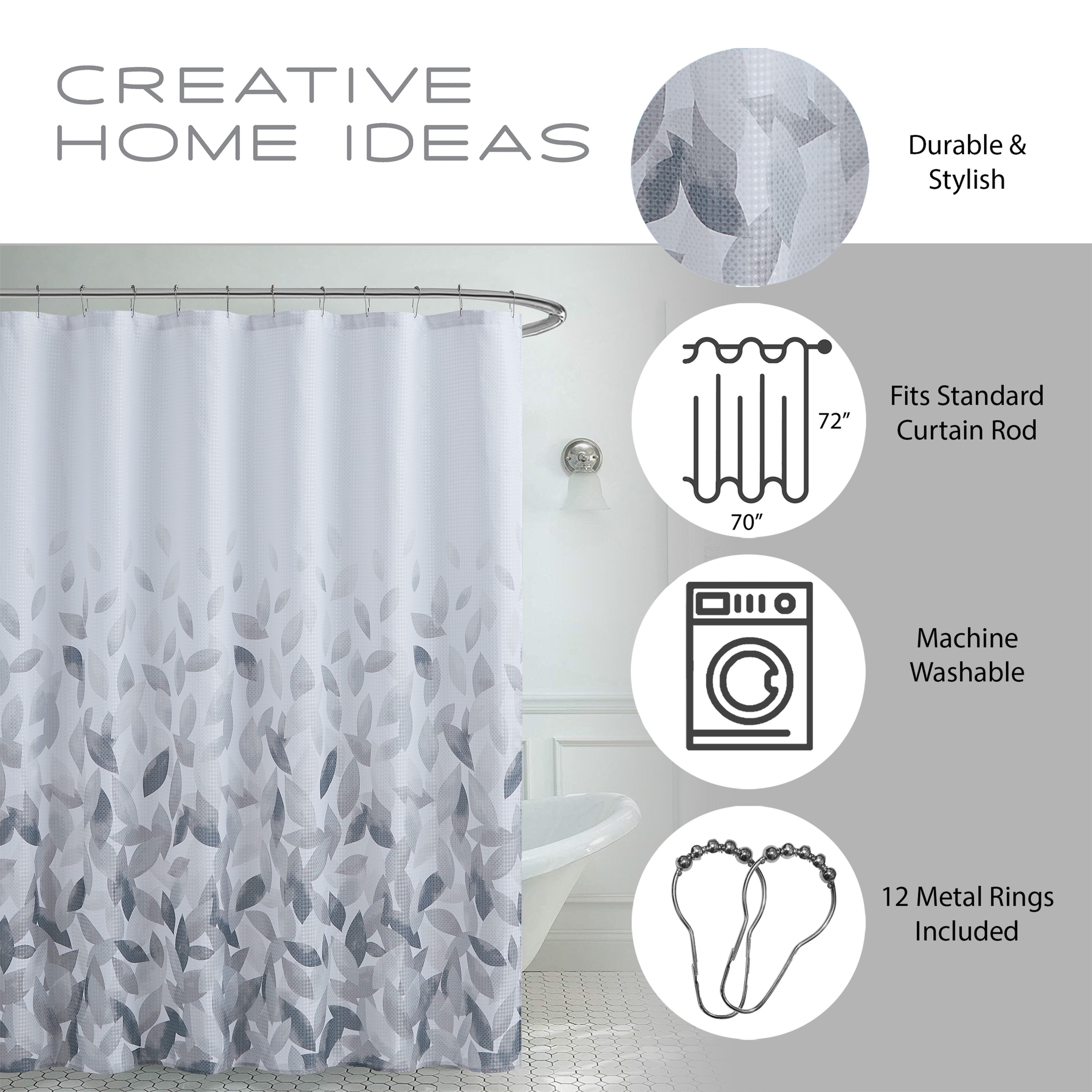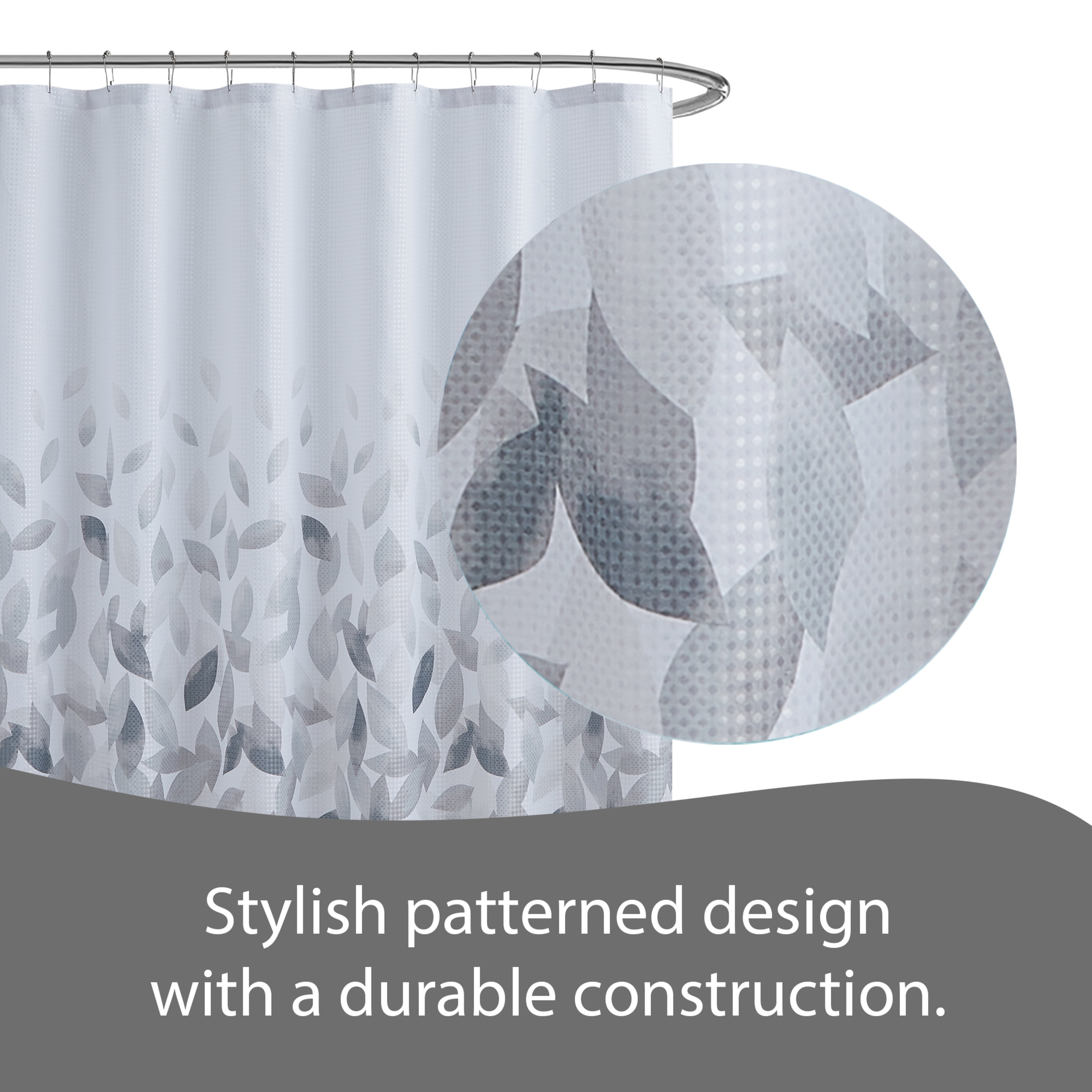 Spruce up your bathroom décor with the Ombre Leaves Shower Curtain Collection by Creative Home Ideas. With a falling leaves woven design, your bathroom will now bring a cozy vibe to your home. Set includes (1) 70 x72 inch shower curtain with a button hole header and (12) silver metal hooks for easy set-up. Liner not included, recommended to purchase separately. Available in several colors: grey, blue, and aqua.