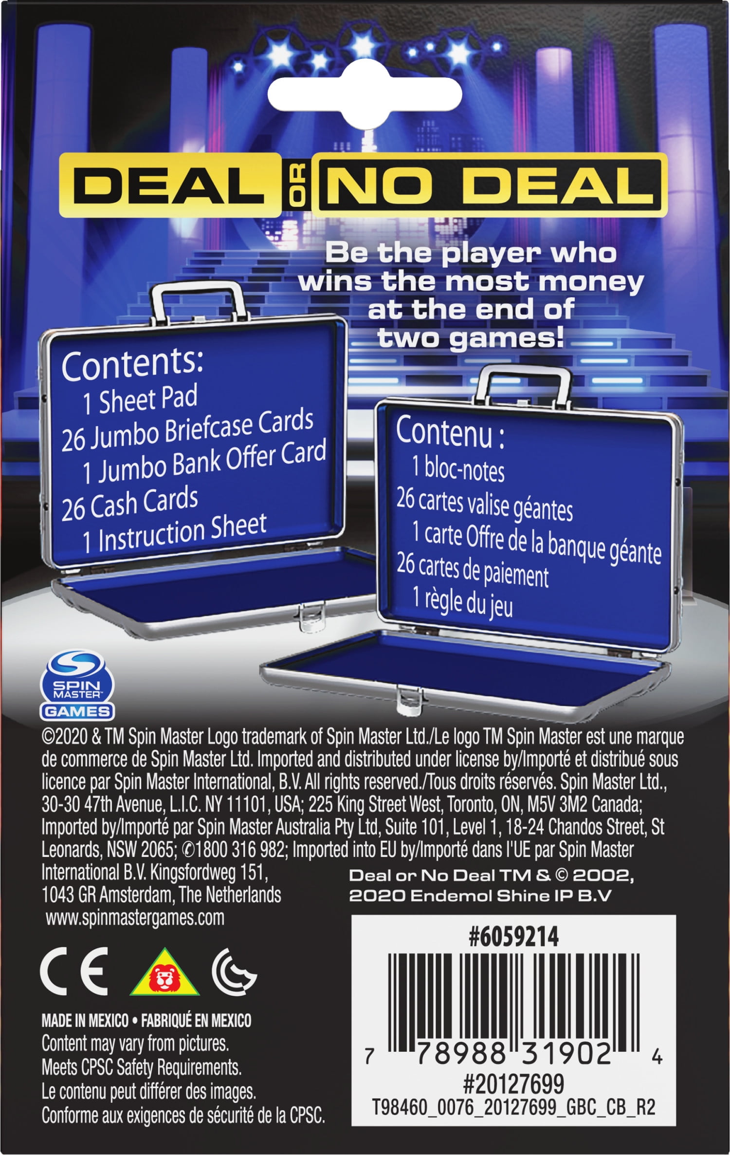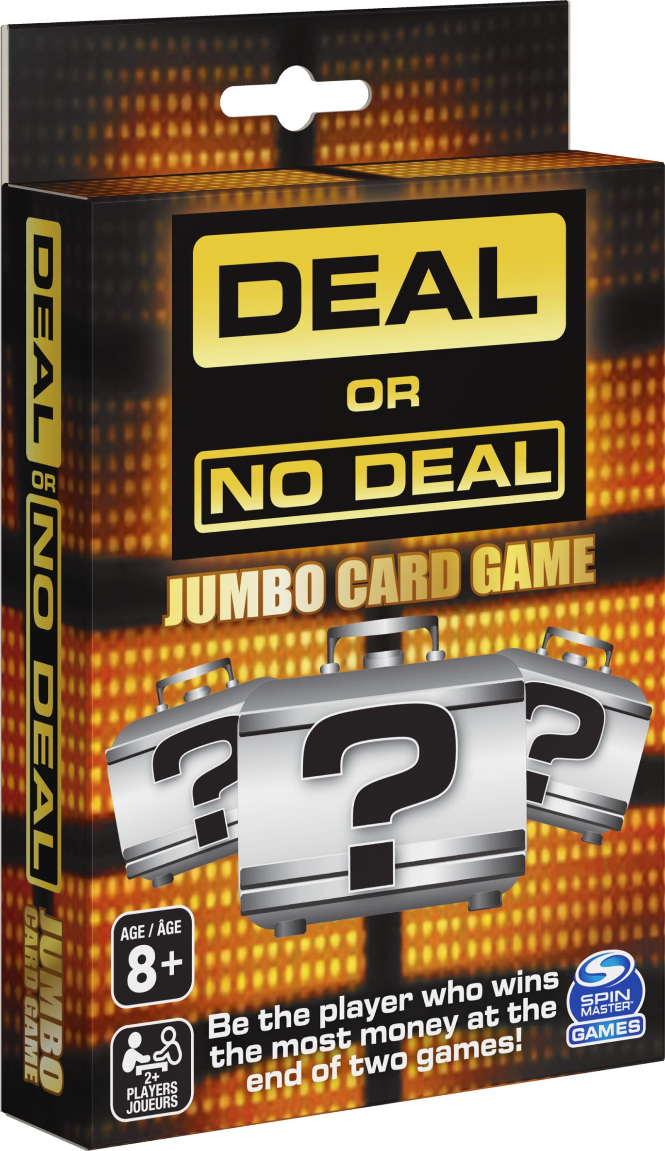 Now play the hit game show right in your own home or on the go with the all-new Deal or No Deal Jumbo Card Game! In Deal or No Deal, it’s a process of elimination that leaves a player with two “cash-stuffed” briefcases to choose from, if they don’t accept an offer from the banker first. Challenge a pal to see who winds up with the most “cash” in the end.*
