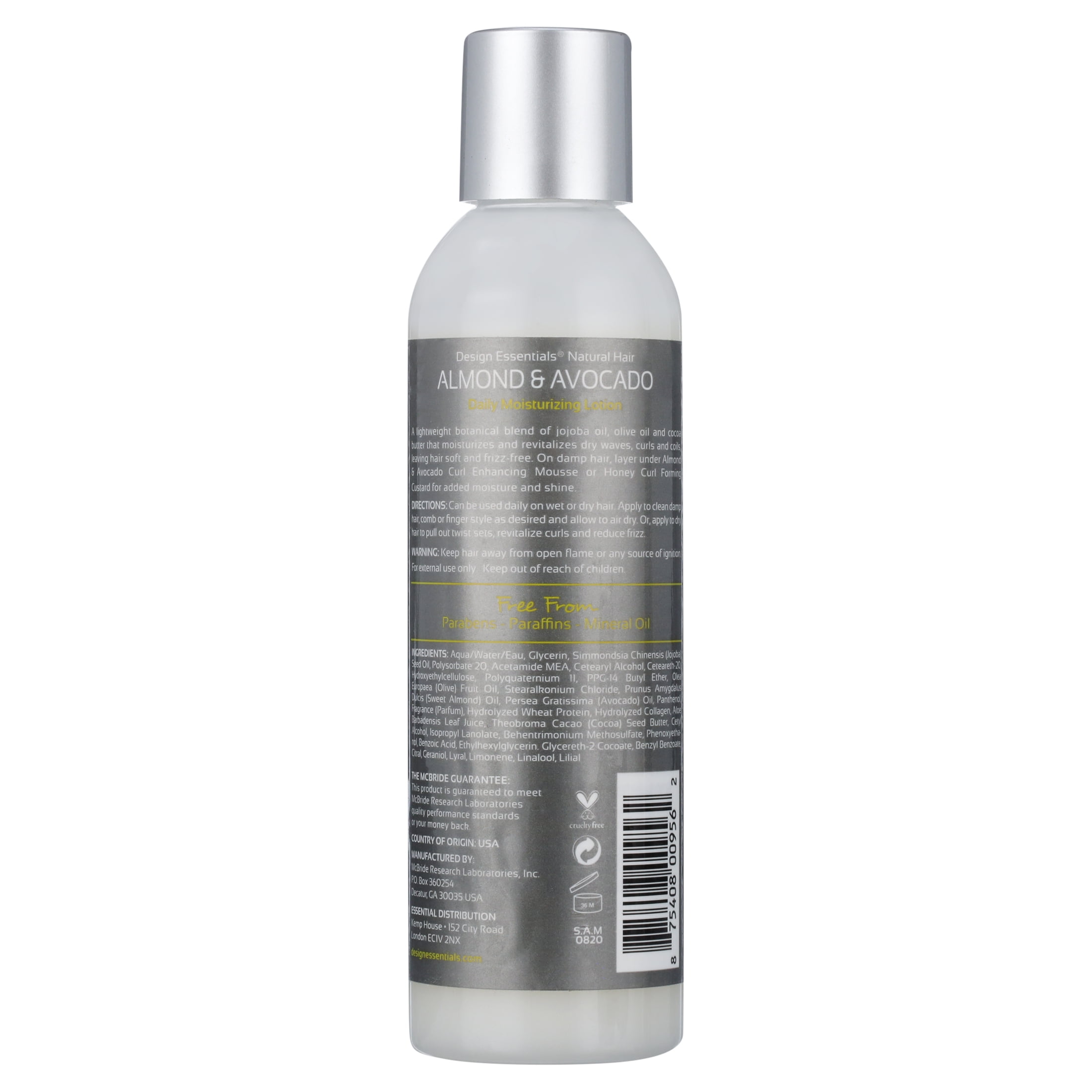 Give your hair the daily refresh it deserves. Our Design Essentials® Natural Almond & Avocado Daily Moisturizing Lotion is an ultra-lightweight botanical blend of jojoba oil, olive oil, and cocoa butter. This lotion moisturizes and revitalizes dry weaves, curls, and coils without weight hair down. The beautiful result: Soft, manageable, frizz-free hair. How To Use: Apply clean, damp hair, Comb through or finger style as desired and air dry or diffuse or, apply to dry hair to pull out twist sets, revitalize curls and reduce frizz.