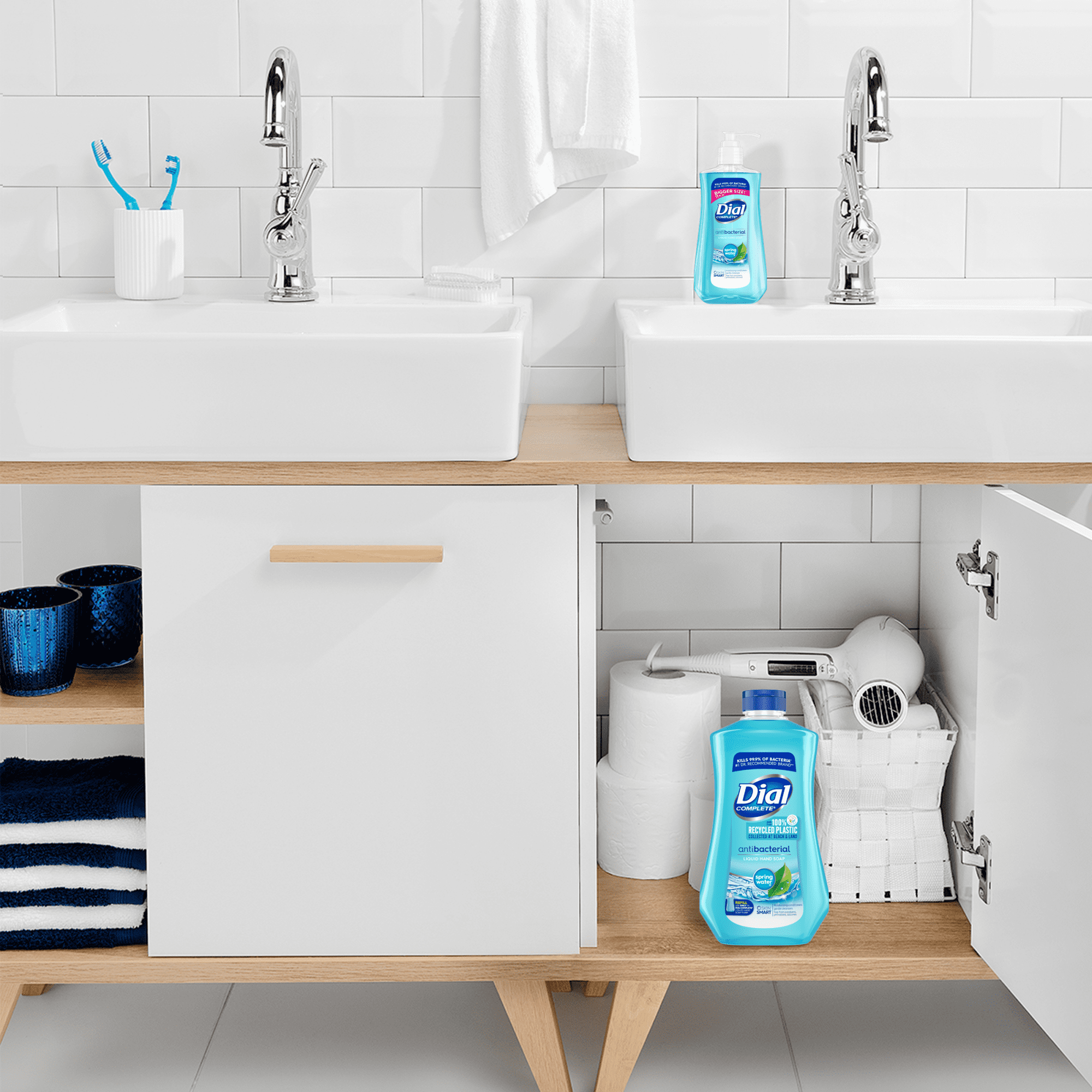 Feel the sensation of an invigorating clean with our Dial Spring Water Antibacterial Liquid Hand Soap. Find refreshment in a hand wash that removes dirt and bacteria while conditioning skin. Now you can get tough on dirt and bacteria while being gentle on your hands. This Dial antibacterial hand soap kills 99.99% of bacteria found in your home, plus it’s mild enough for frequent use. Dial is the number one doctor-recommended hand soap brand! Awaken your senses as you wash, with the natural and refreshing scent of spring water that’ll leave you with healthy feeling skin, plus a scent the whole family will love. This package contains one 11 fl oz pump bottle of Dial Complete Antibacterial Liquid Hand Soap, Spring Water. How to use: 1. Pump into hands 2. Lather vigorously in hands for at least 30 seconds 3. Rinse clean with water 4. Enjoy soft, healthy feeling hands.