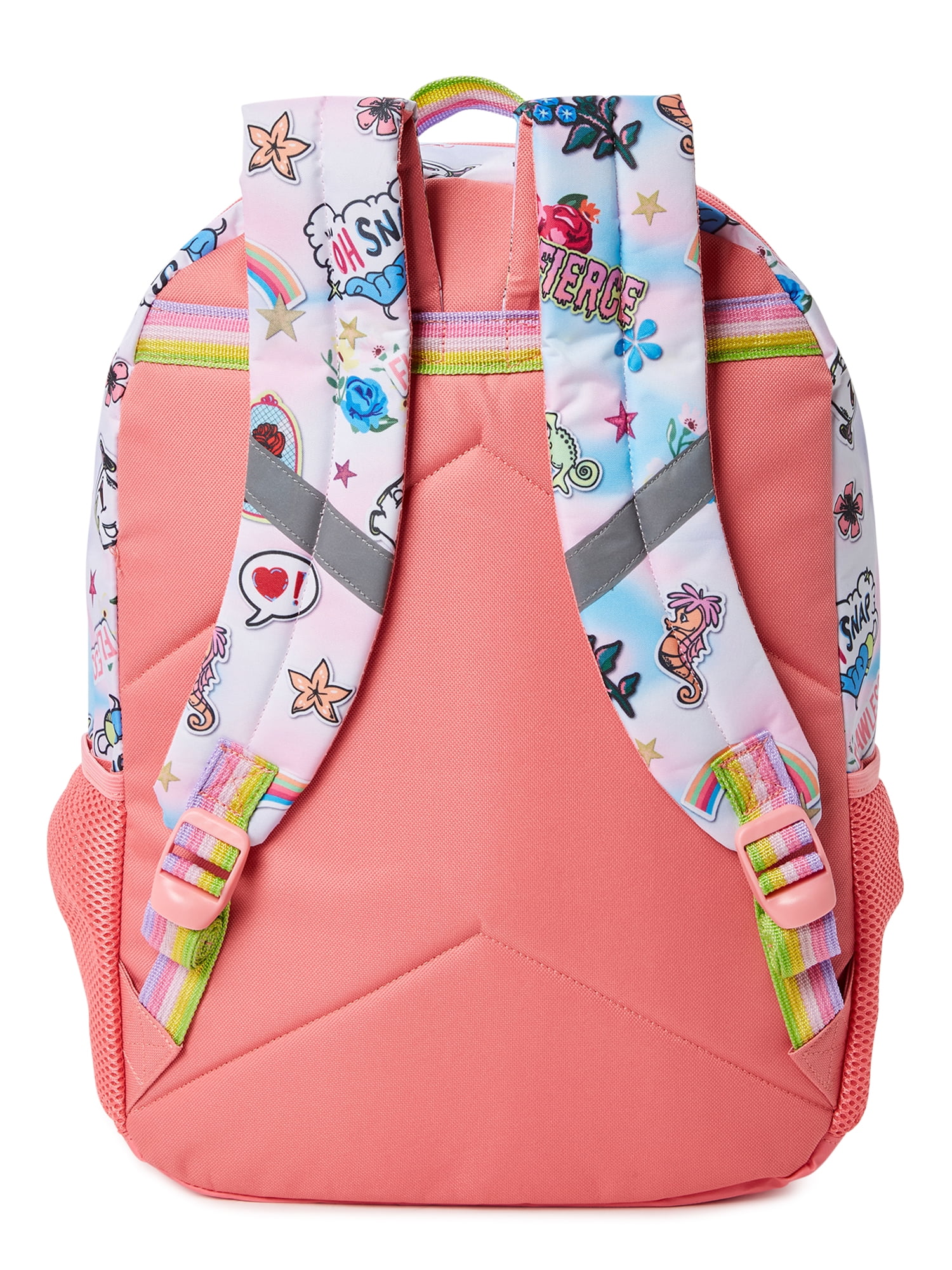 - Backpack: Zip around closure; adjustable shoulder straps with reflective detail; one front zip pocket; two side foam mesh pockets; one inner padded laptop sleeve; allover print