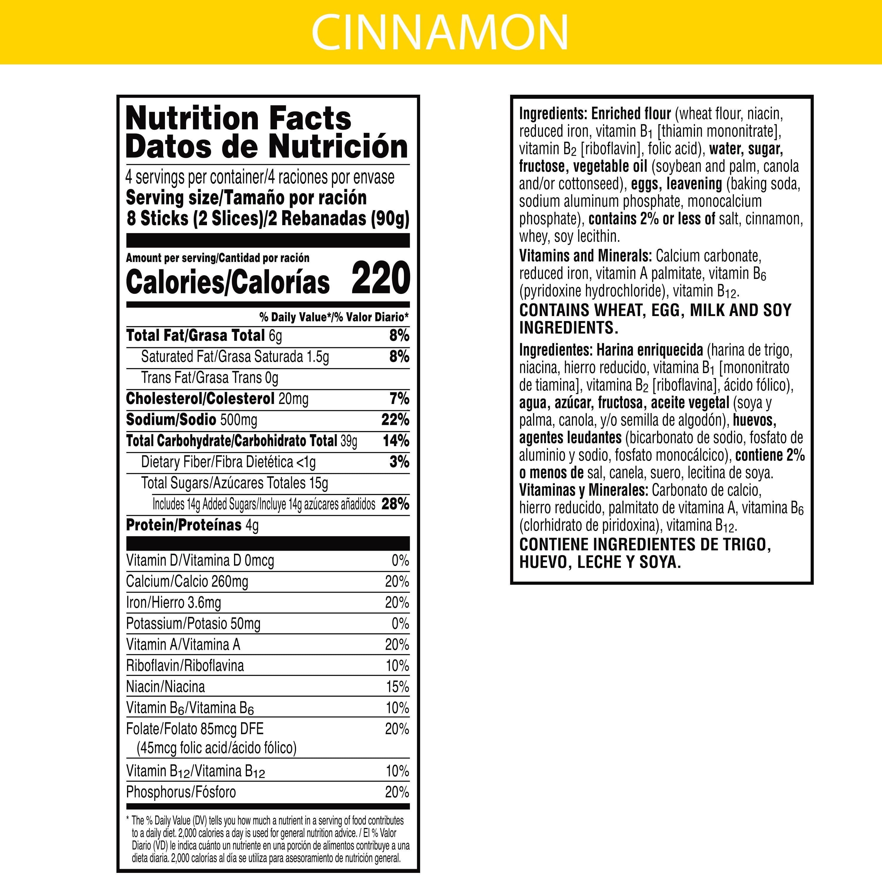 - Includes 1, 12.7oz box containing 8 French Toaster slices; 32 French Toaster Sticks total; Resealable packaging for freshness and great taste
