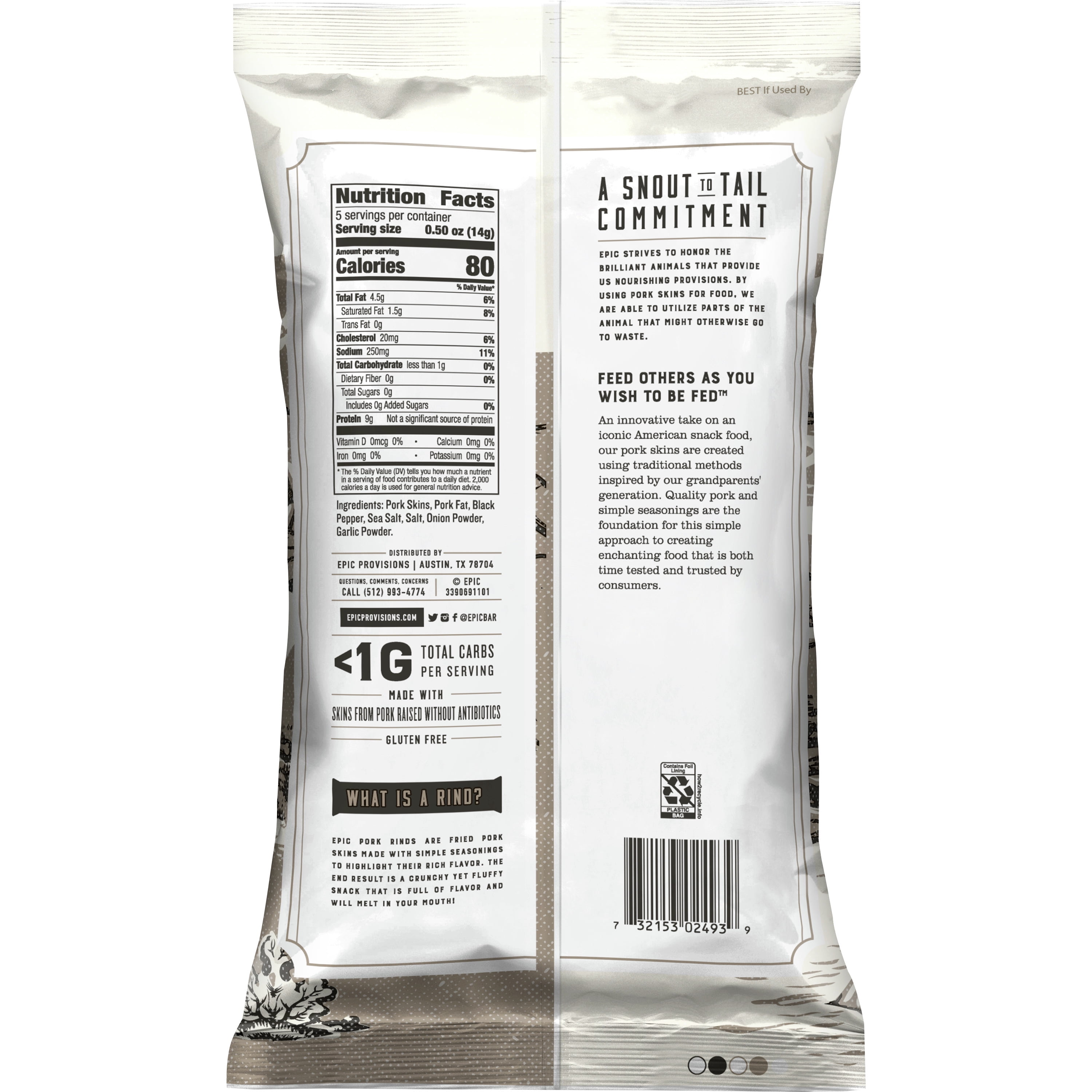 A modern take on a classic American snack, EPIC Provisions Pork Rinds are made from a blend of antibiotic-free, non-GMO, organic, and pastured pork complemented with salt and pepper. They’re gluten-free, Paleo-friendly, and filled with an abundance of protein. Allowing more whole animal utilization, pork skins are an extension of EPIC’s Whole Animal Project, a “snout-to-tail” commitment to honor each animal sourced.What is a rind? A rind is a fried pork skin taken from either the belly or back of a hog. This skin is softer in texture and has more subcutaneous fat when compared to the shoulder. Additionally, pork rinds have very little meat cooked into the product. The end result is the perfect lightweight snack that melts in your mouth.