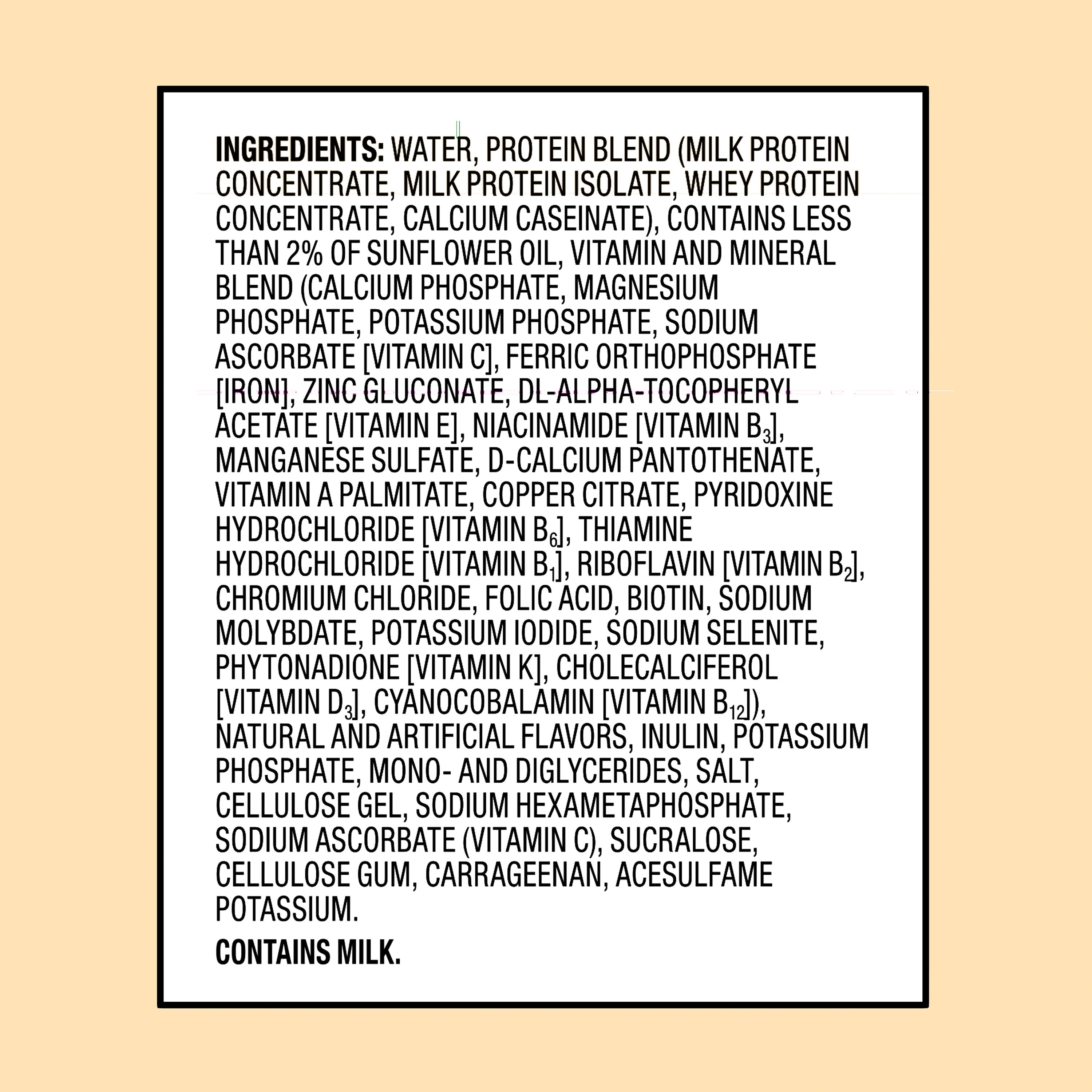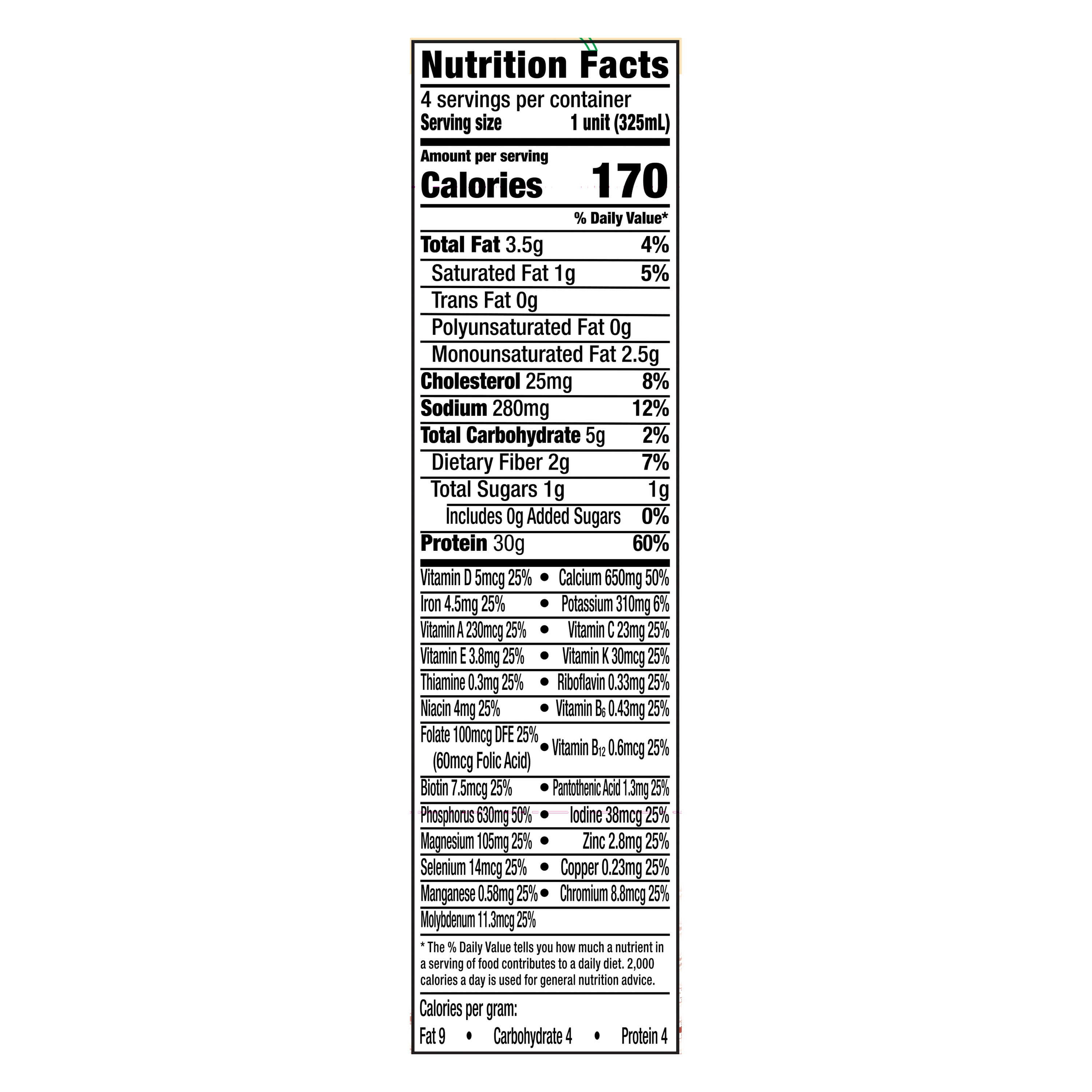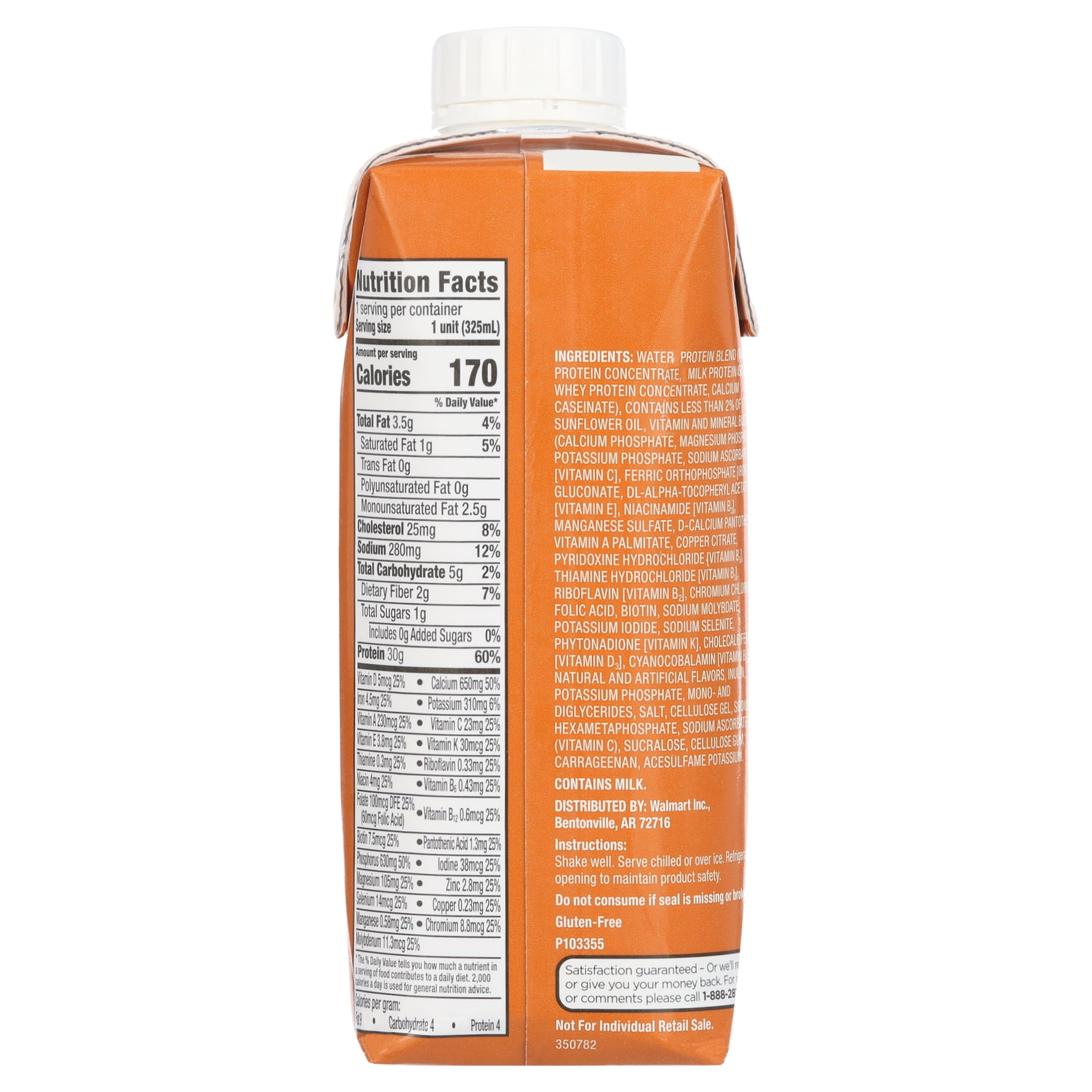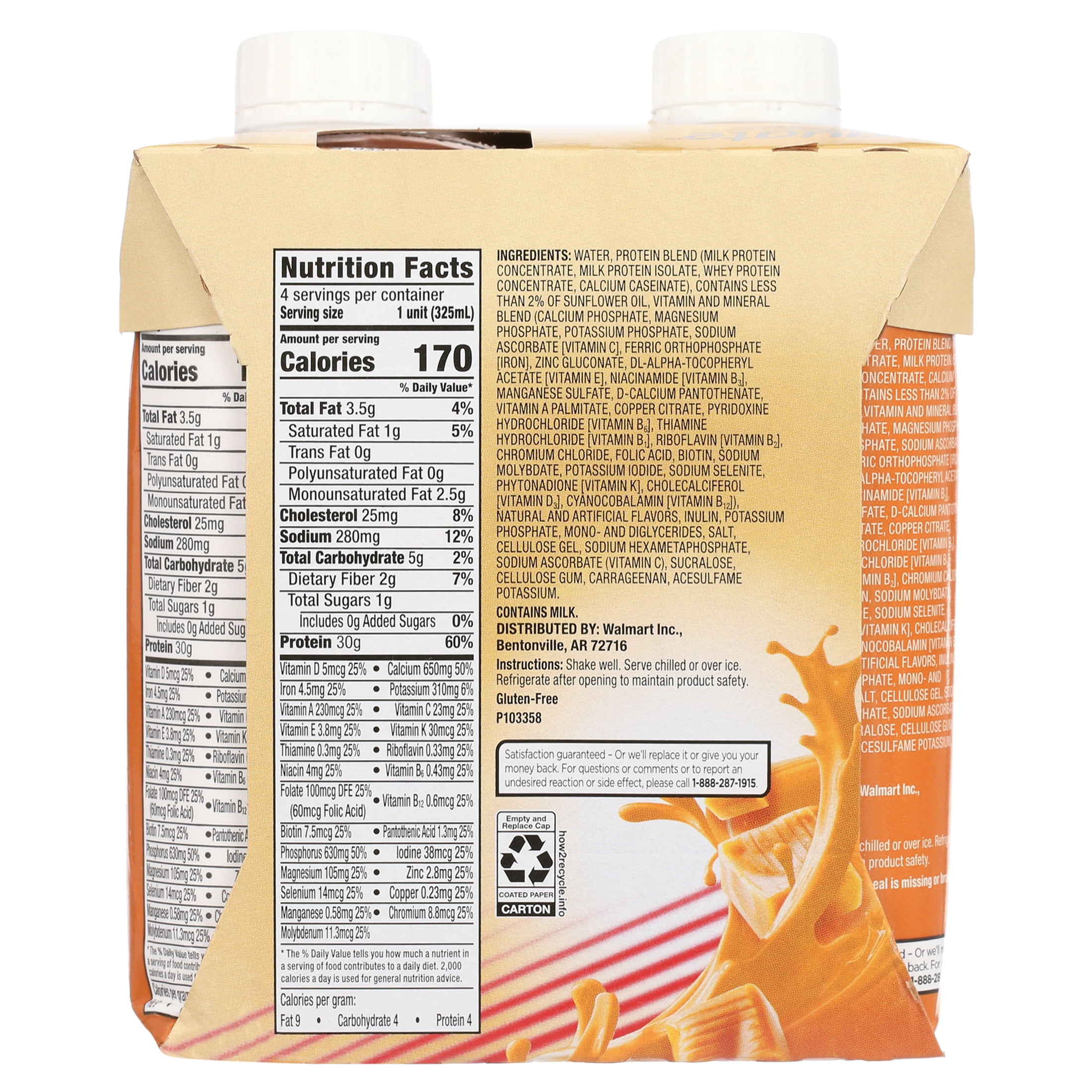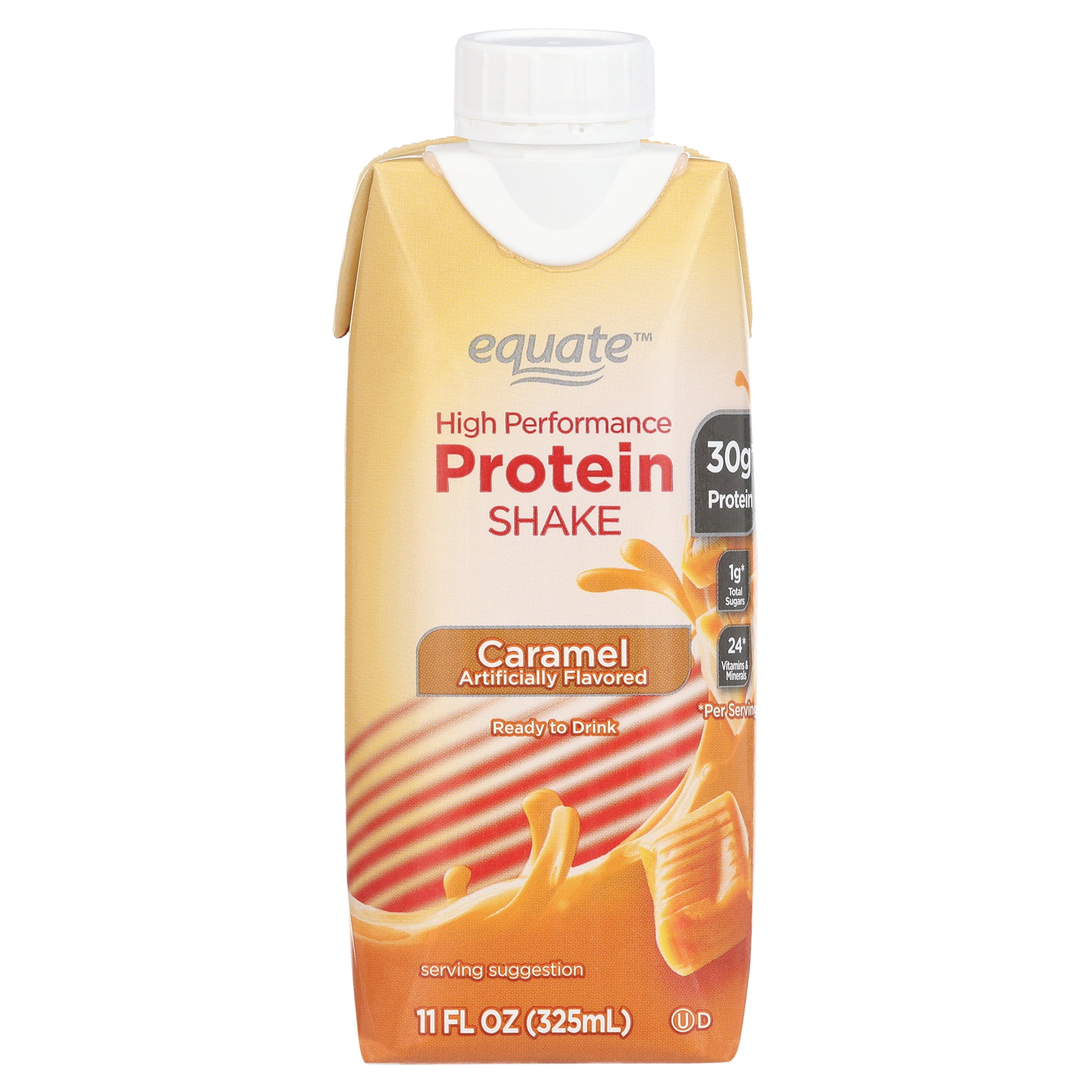 Keep this Equate High Performance Protein Shake handy for a satisfying and healthy drink. The caramel flavor gives it a sweet and rich taste to enjoy. Each shake is packed with nutrients, including 30g of protein and 24 vitamins and minerals per serving. They’re also a good source of iron, calcium and vitamin D. Drink an Equate protein shake to help build muscle mass and stronger bones. With only 1g of sugar in each serving, it can be a safe choice for a low-sugar diet. Individuals who are sensitive to gluten can enjoy the Equate caramel protein shake as well, thanks to its gluten-free formula. It comes ready to drink right away without the need for any extra prep work. Each shake contains enough nutrients to take the place of an entire meal. Grab one when you need to curb hunger and satisfy appetite quickly and conveniently. It can also make for a tasty and healthy snack to take with you when on the go. This drink is certified kosher.