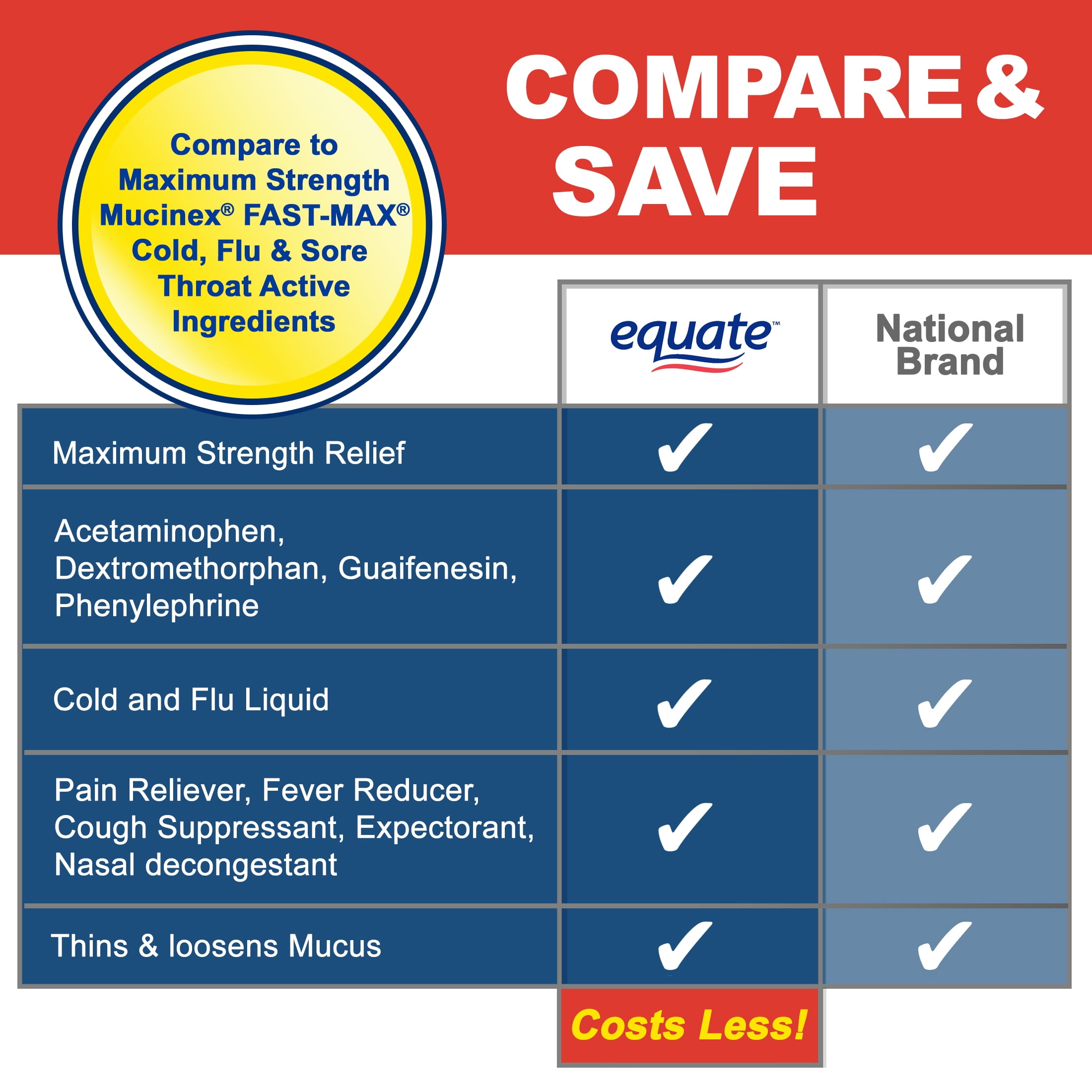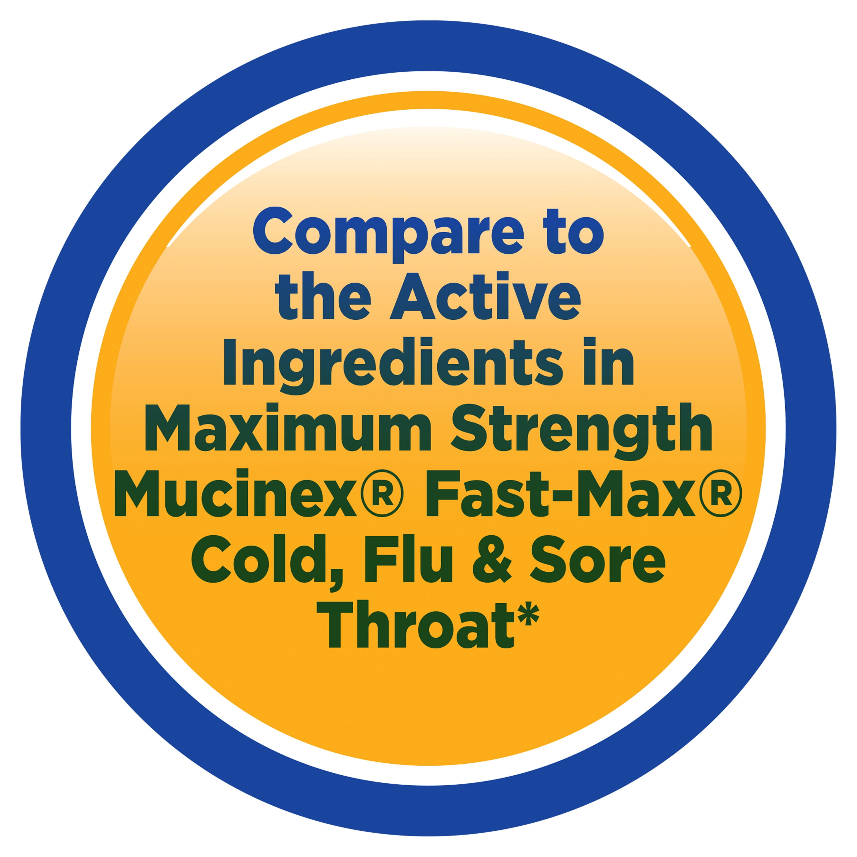 - Compare to Maximum Strength Mucinex® Fast-Max® Cold, Flu & Sore Throat active ingredients