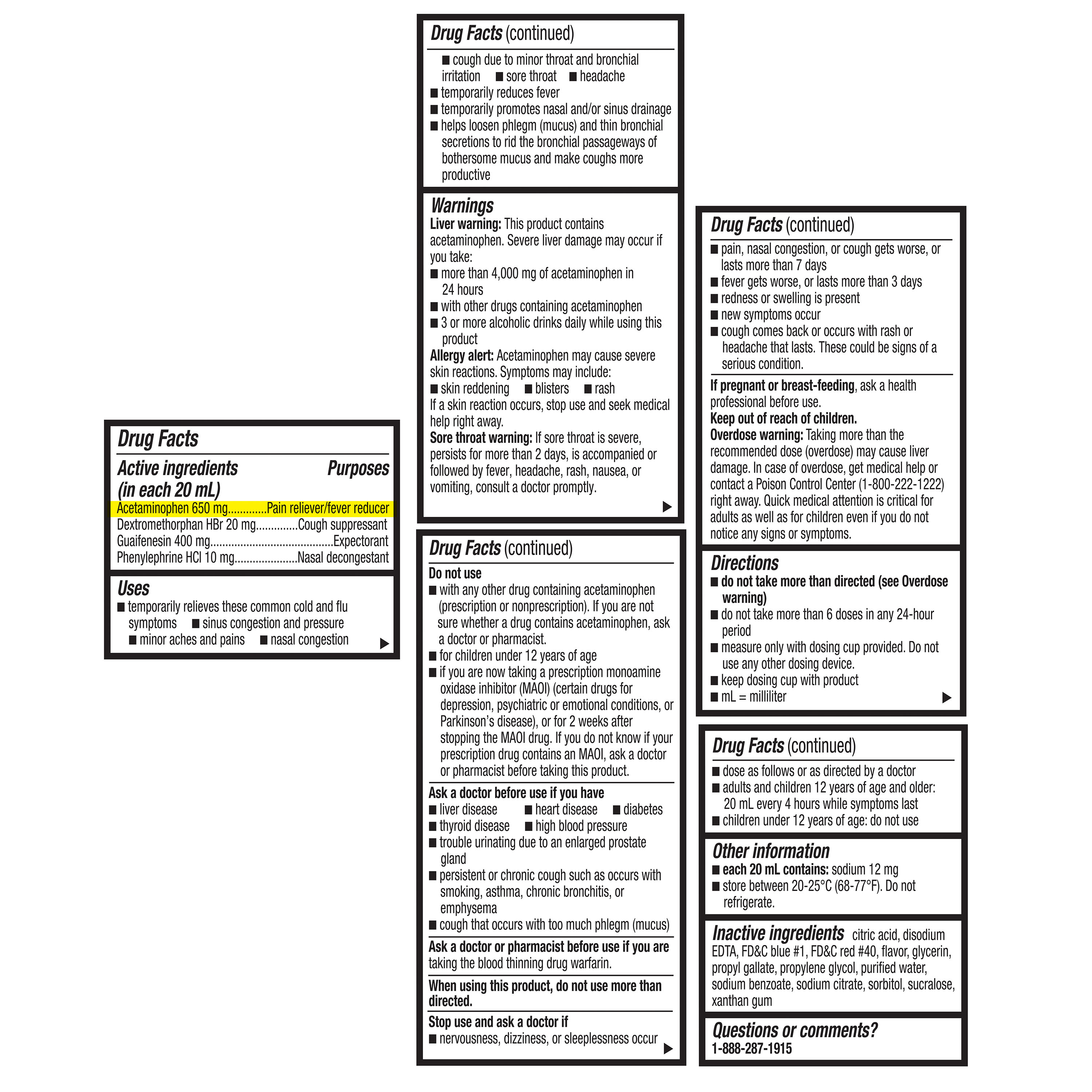 - Active Ingredients: Acetaminophen 650 mg – Pain Reliever/fever reducer, Dextromethorphan HBr 20 mg – Cough suppressant, Guaifenesin 400 mg – Expectorant, Phenylephrine HCI 10 mg – Nasal decongestant