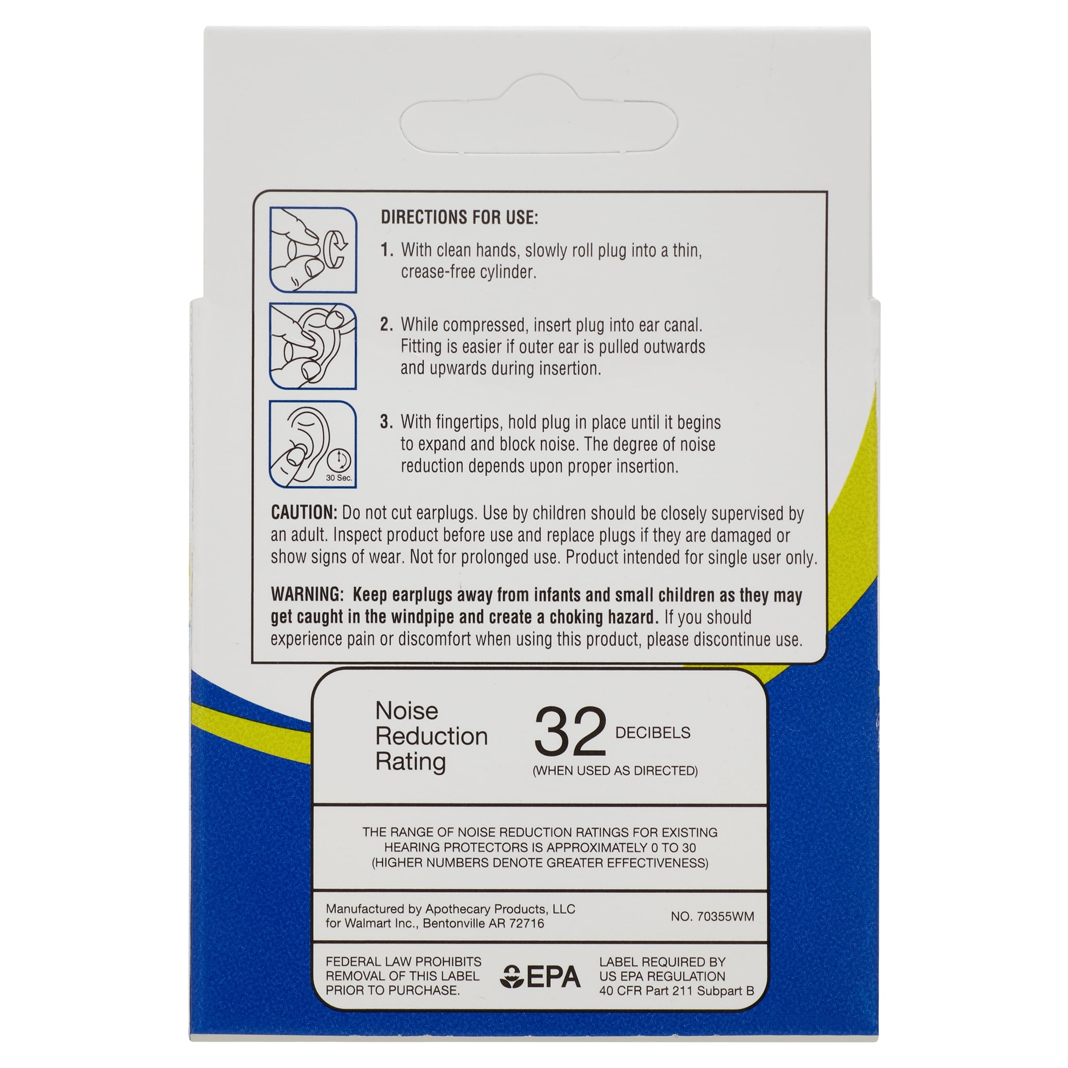 Equate Ultra Soft Foam Ear Plugs are a comfortable and smooth fit to successfully assist in canceling noise. The soft tapered foam has a 32 dB noise reduction rating that helps take away any outside sounds. Do not cut earplugs. Use by children should be closely supervised by an adult. Inspect product before use and replace plugs if they are damaged or show signs of wear. Get the peace and quiet you need with Equate Ultra Soft Foam Ear Plugs.
