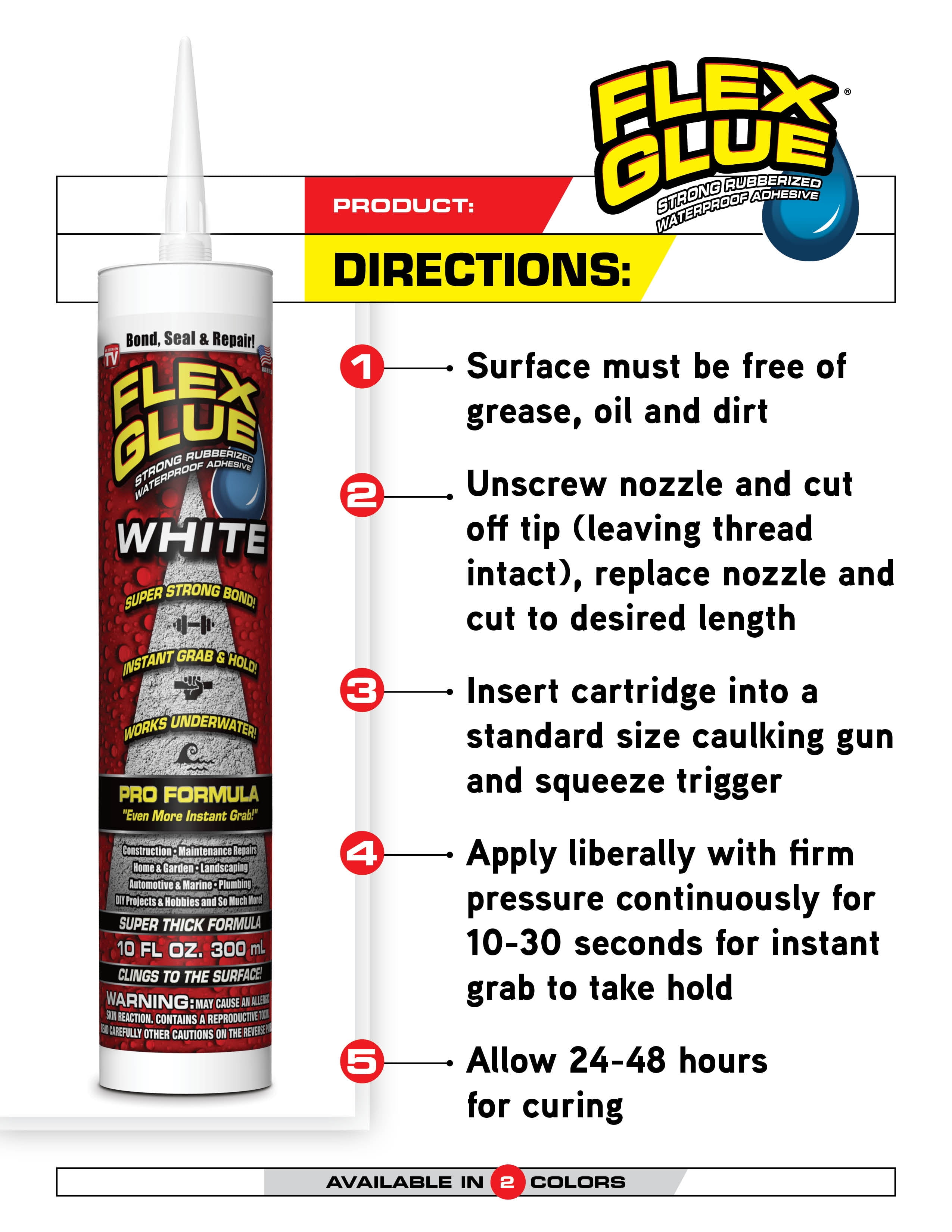 Flex Glue is an easy-to-use, super strong, rubberized, waterproof glue that instantly bonds, seals and repairs virtually everything. No need for screws or nails, it is perfect for all types of repairs! Flex Glue’s super thick adhesive is specially formulated to work on all types of surfaces. It clings to the surface and can be used on dry or wet surfaces…even underwater. Flex Glue’s amazing instant grab holds objects in place and in most cases eliminates the need for braces. Flex Glue gets stronger over time, fully cures in 24 – 48 hours and reaches maximum strength in 7 days. Flex Glue is mildew and UV resistant, paintable, solvent free, VOC compliant, and has a low odor. Flex Glue will not shrink, crack, run or drip and can easily be applied to vertical and overhead surfaces! Once complete, just squeeze a small bead from the opening to form a plug, then simply cut the plug when you want to reuse. Bond, Seal, and Repair!