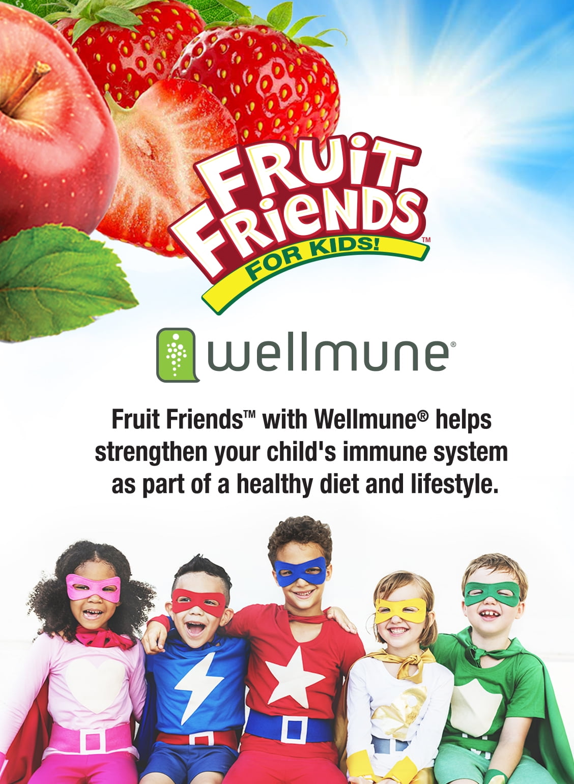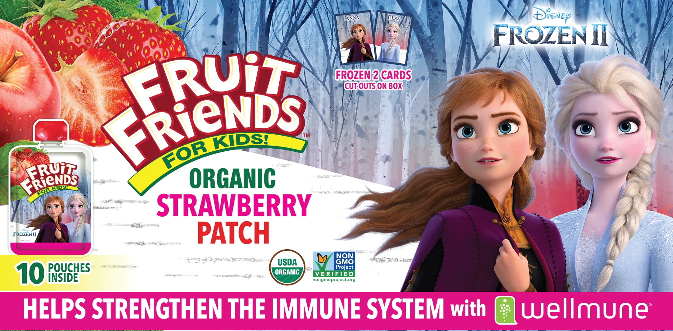 Power up with Fruit Friends, the fruit snack that has your back. Even Elsa agrees, you’re never gonna want to let this pouch go. Fresh berry flavor lends itself to the freshness of our fruit pouch. Berry good, indeed. Ingredients: Organic Apples, Organic Strawberries, Baker’s Yeast Beta Glucan Wellmune, Ascorbic Acid (Vitamin C) to retain color. Each delicious pouch is one full serving of 100% real fruit, fortified with immune system support, and has no added sweeteners. What is Wellmune? Wellmune is a leading natural yeast beta glucan clinically proven to help improve general immune health, maintain overall physical health, protect against the harmful effects of stress and promote healthy energy levels and mental clarity.