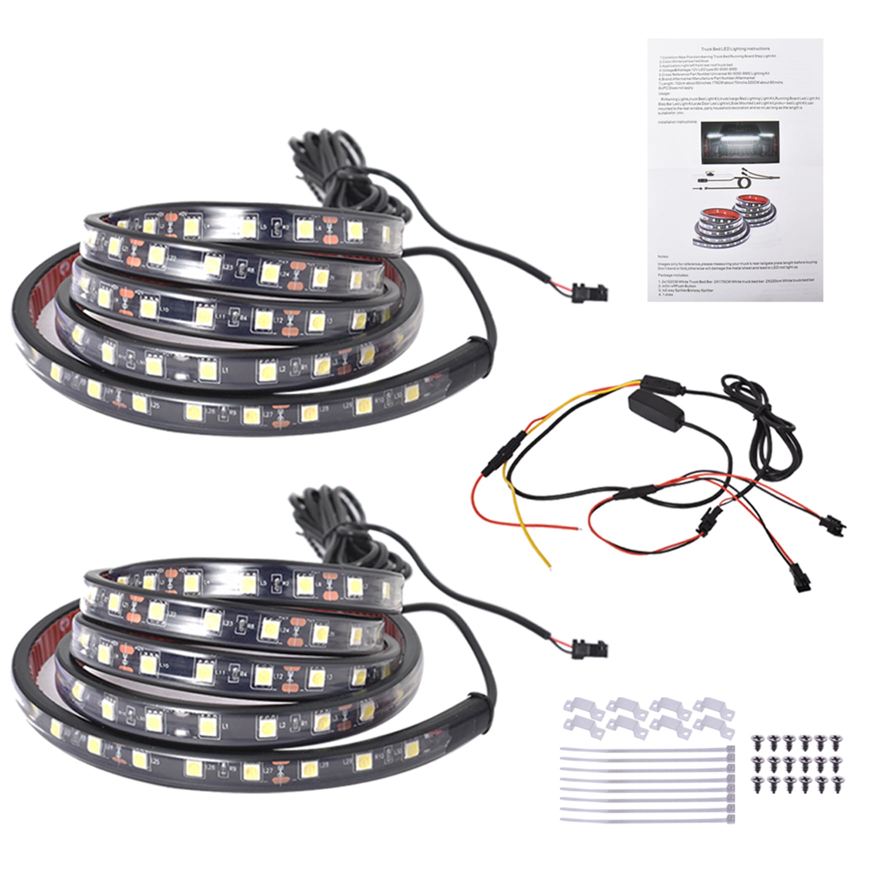 2PCS White 60" LED lights, long enough for Pickup/Truck/RV Awning/SUV/Cargo/Camper lighting or home party decoration. The lights can be side mounted on anywhere that has 12V power source, and the adhesive and extra ties help to fix the strips. Coming with on/off button and blade fuse, allows you to easily control the lights and keep your car running safely.