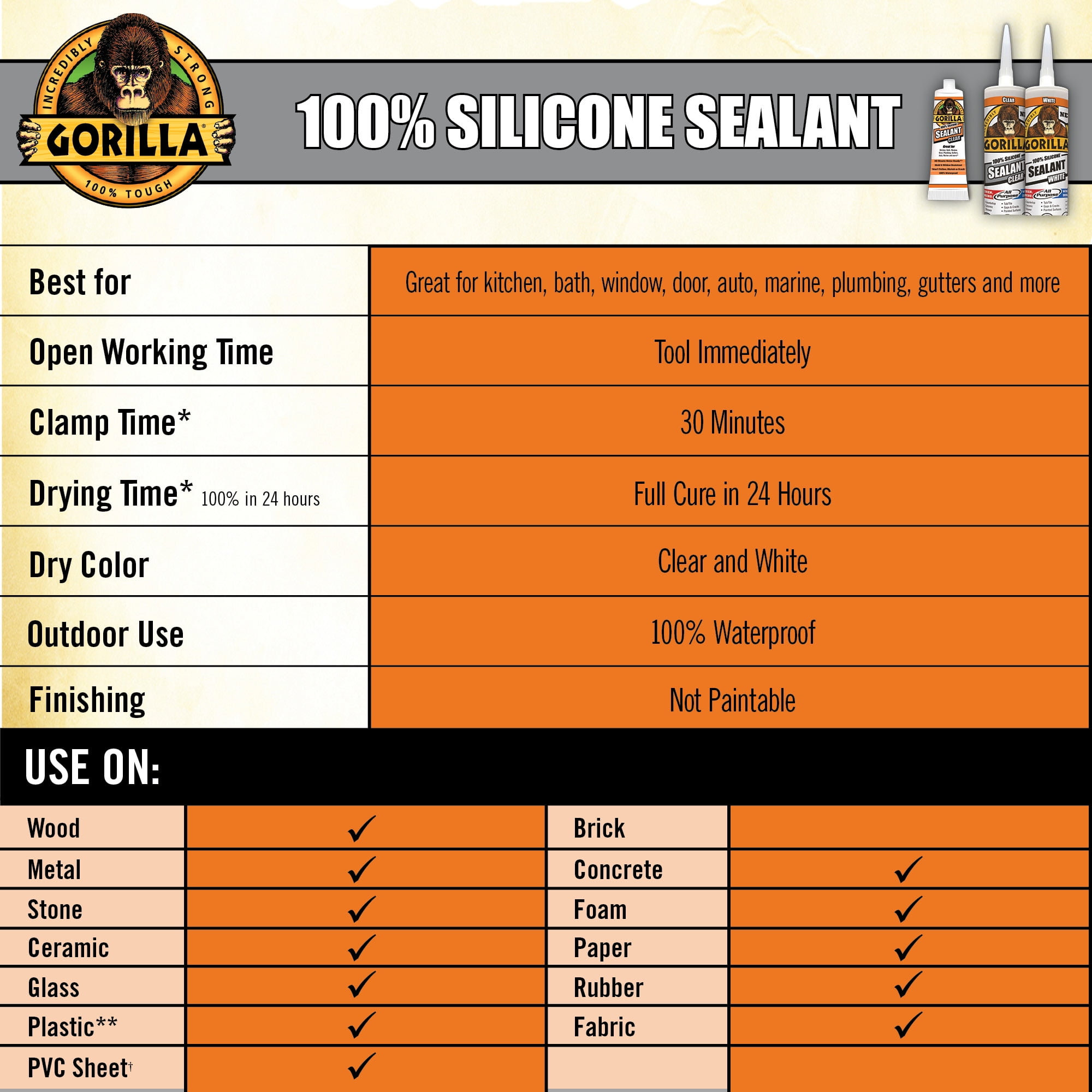 Gorilla White 100% Silicone Sealant is great for kitchen, bath, window, doors, plumbing, gutters and more! Ready for water exposure in just 30 minutes, this sealant is mold & mildew resistant and won’t yellow, shrink or crack over time!