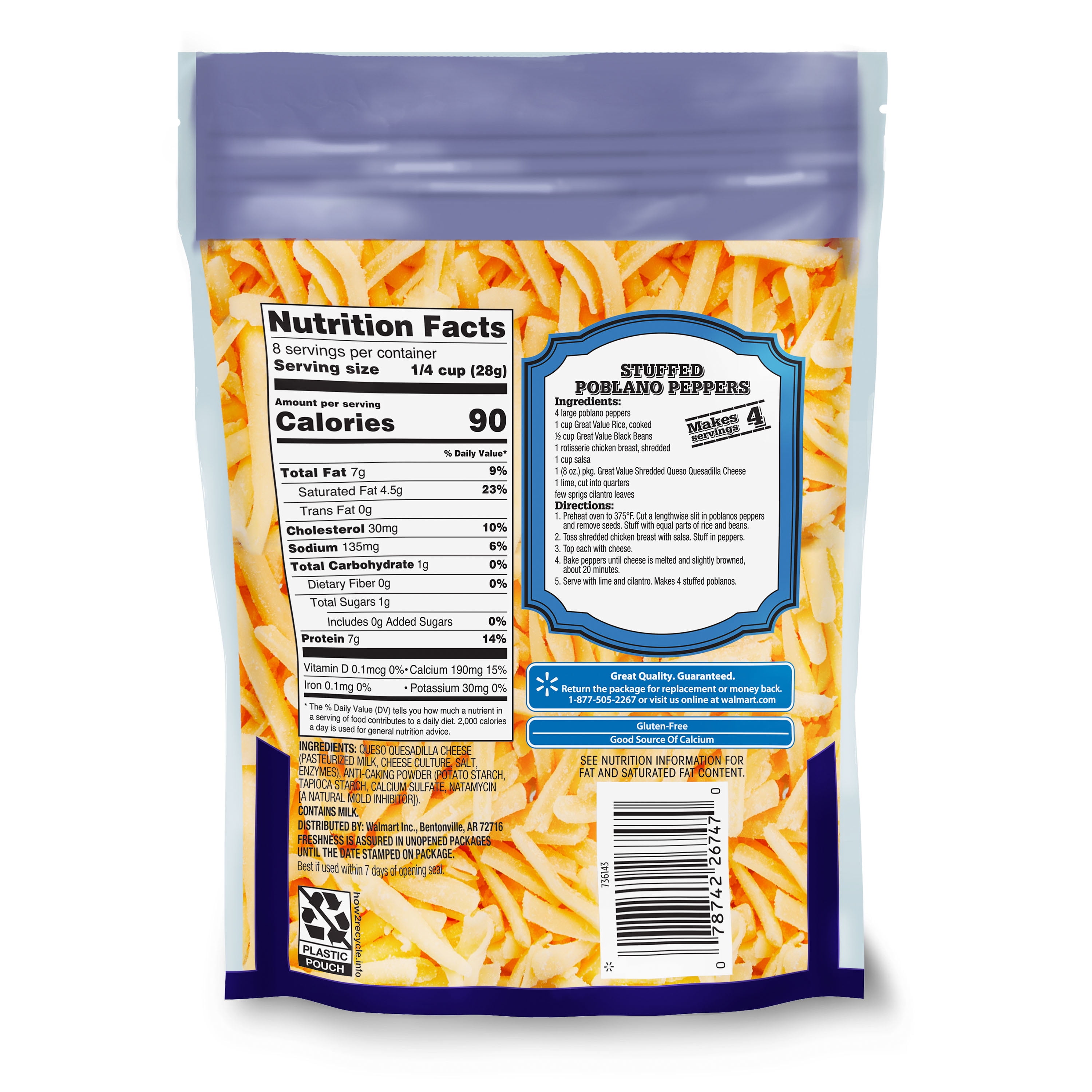 Whip up a delicious batch of quesadillas with our Great Value Shredded Queso Quesadilla Cheese. This mild, versatile Mexican-style cheese melts beautifully, making it easy to prepare quesadillas, queso dip, nachos, and other Tex-Mex inspired snacks and appetizers. The back of the packaging even includes a recipe for stuffed Poblano peppers that is sure to delight! With about two cups of cheese, pre-shredded for your convenience, in each eight-ounce bag, you’ll have plenty for your next family meal night. Enjoy a fiesta of flavor with our Great Value Shredded Queso Quesadilla Cheese.