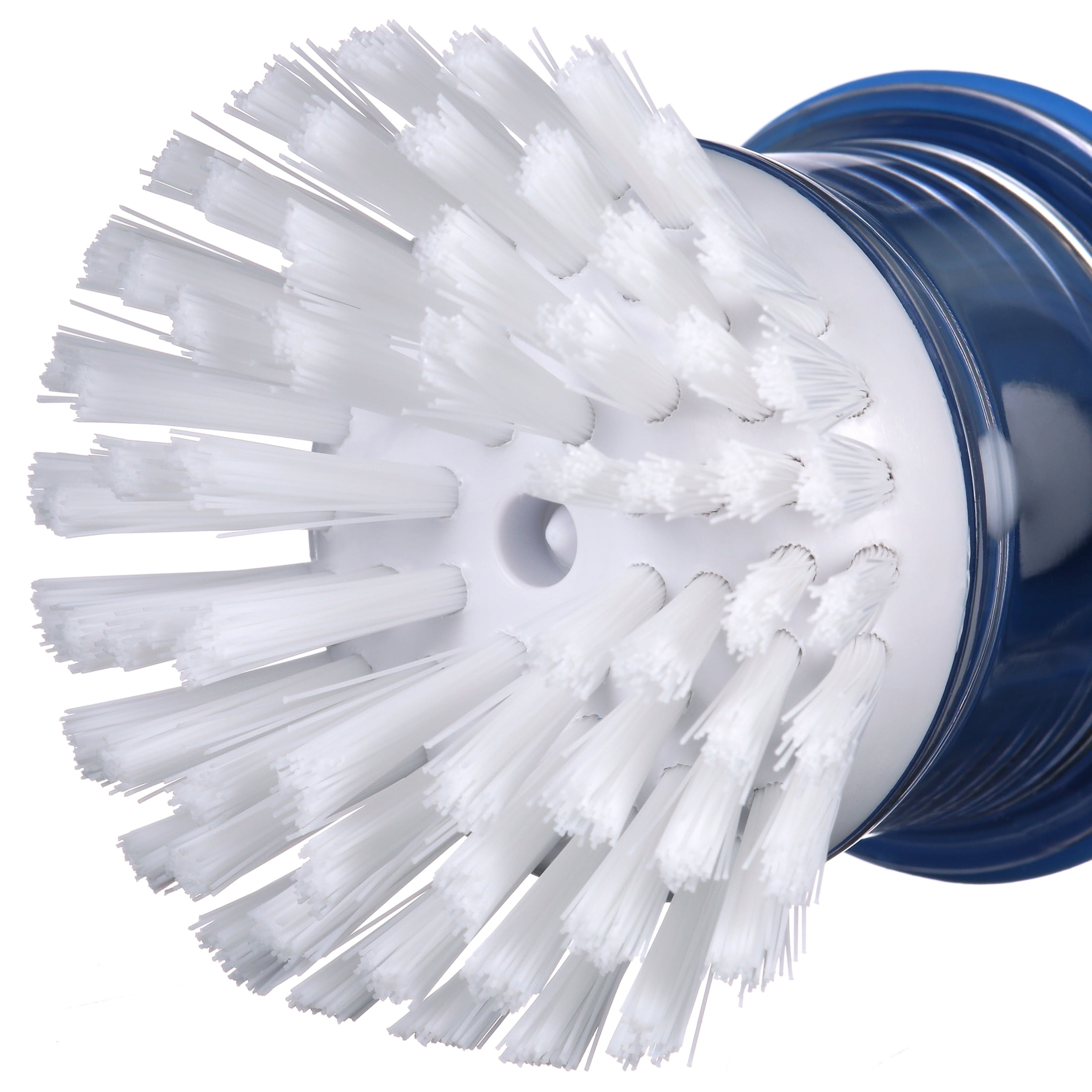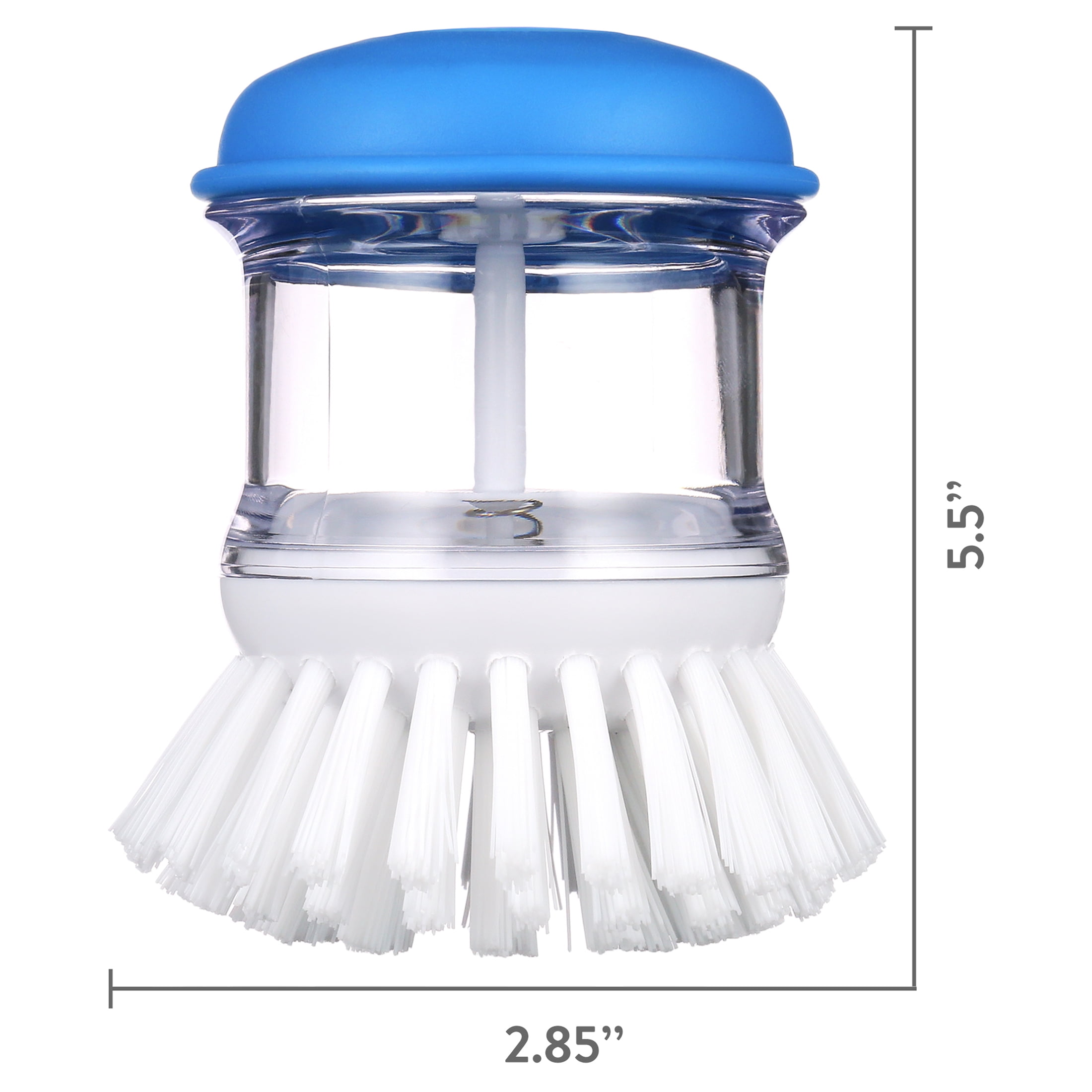 The Great Value Soap Dispensing Palm Brush is a kitchen brush designed with your comfort and usage in mind. It releases soap on demand with the light push of a button at the top. The long-lasting nylon bristles can effectively clean stains, greases and food remains from your pots, pans, and dishes. When empty, simply twist off the top of the brush handle to refill with soap. The top portion rests under your palm and is rubbery and non-slip for better gripping. Once its use is over, wash it in the dishwasher. With this Great Value Soap Dispensing Palm Brush, your dishes will be clean and shining in no time.
