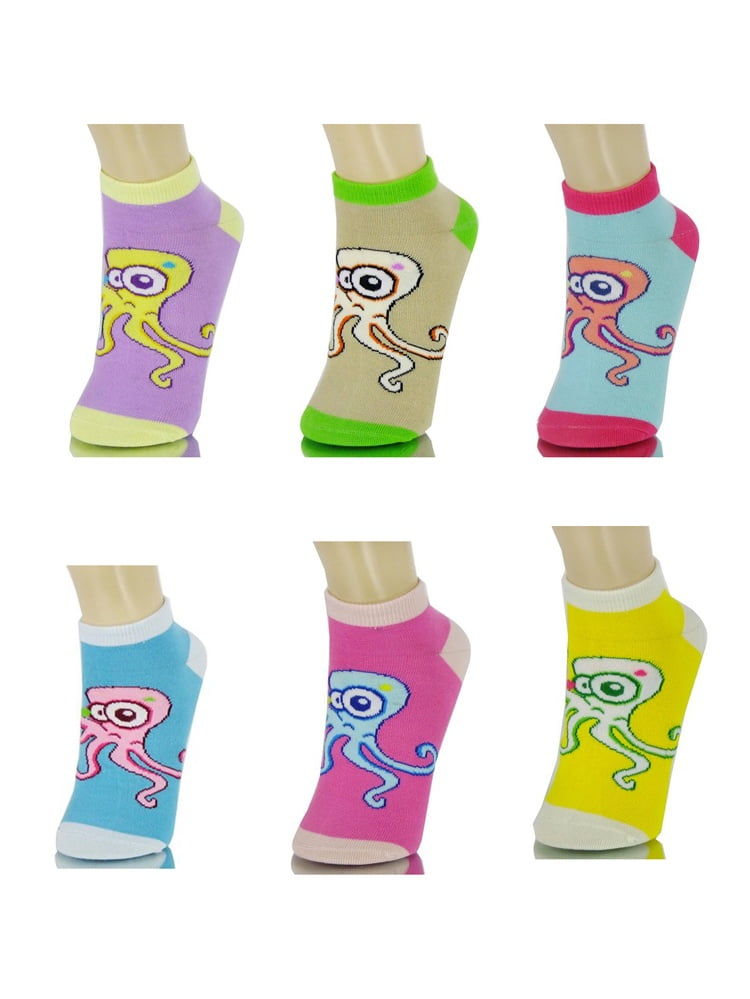 Grope, Octopus Low-Cut Socks;Low Cut, Ankle High Kids Socks.;AdOranged Colorful Octopus.;Several Assorted Colors and Styles, Picked Randomly.;Comes in a 3 Pair Pack.;Size: 4-6.;Made Of 95% Polyester, 5% Spandex.