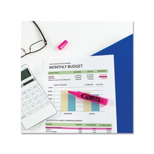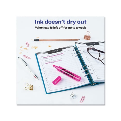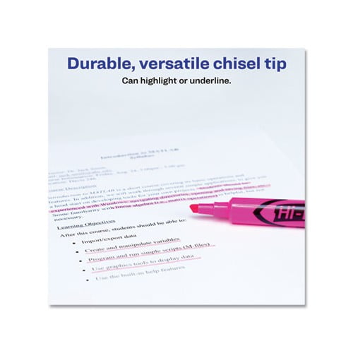 The Smear Safe feature provides smear protection across most pen, marker and inkjet inks. Durable tip for smooth highlighting- won’t fray. Use tip to highlight or underline. Cap can be left off for one week without dry-out. Quick-drying. Safe for office, school, or home. Colors: Fluorescent Pink Color Family: Pink Tip Type: Chisel Retractable: No.