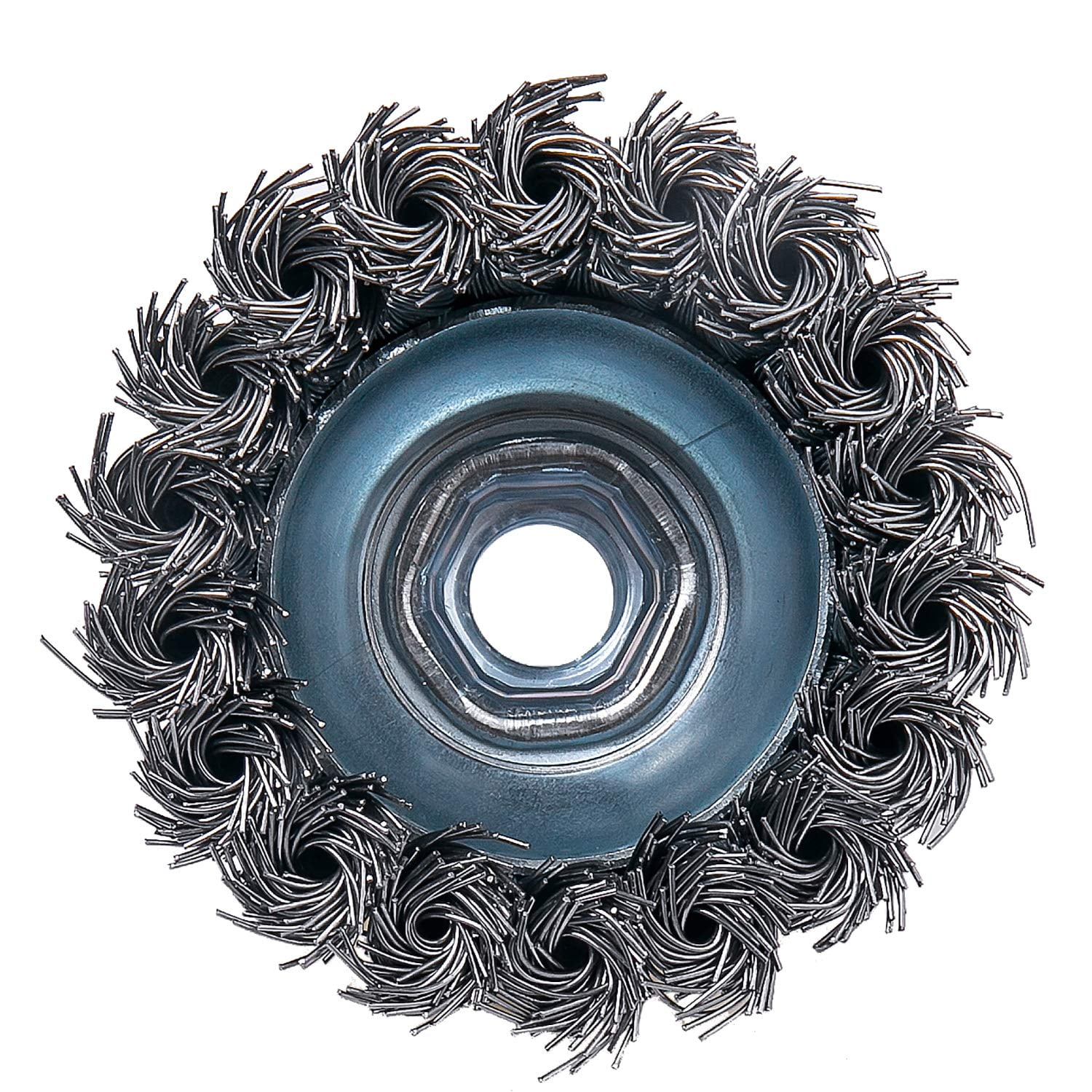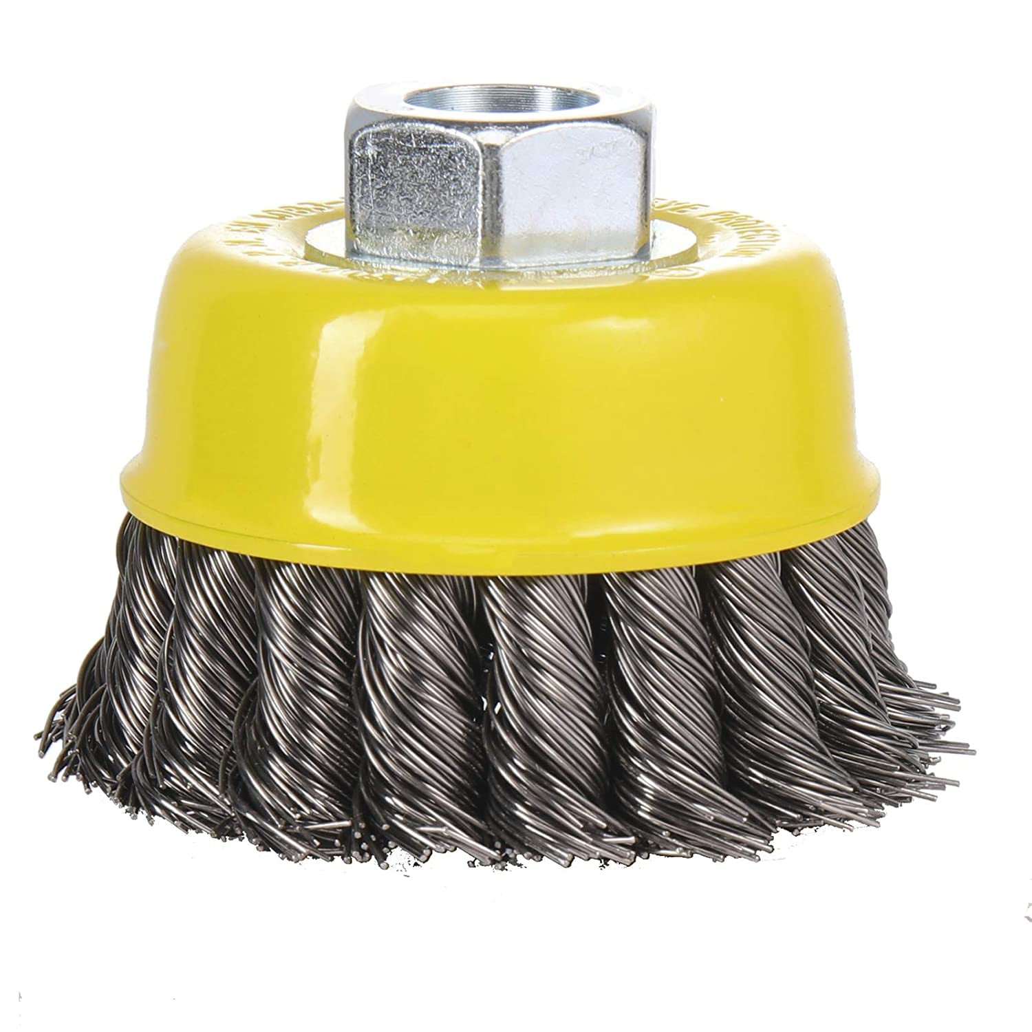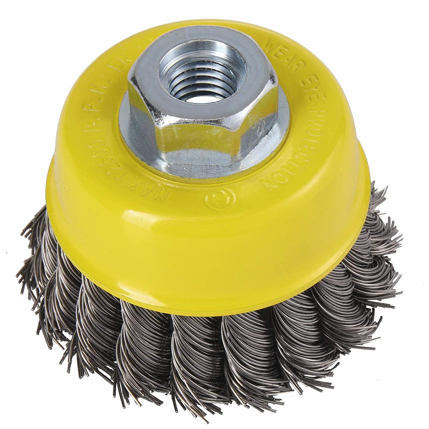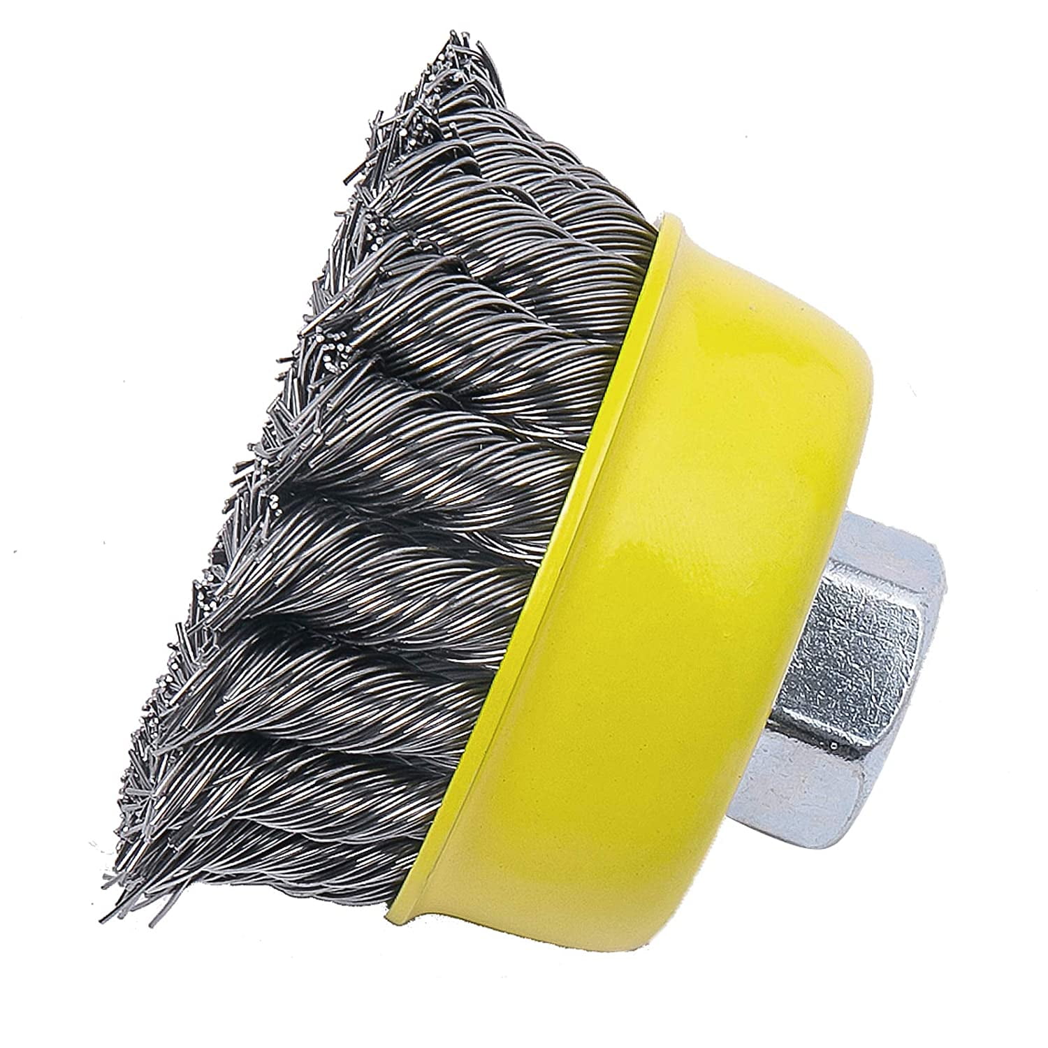 Perfect for cleaning weld beads, deburring machined surfaces, and removing sharp edges from sheet metal. and old greasy build up, precision deburring, rust, spatter and paint removal and cutting or wrought iron railing stripping or surface conditioning and preparation.size:3inch twist knotted wire cup brush,0.020in 65Mn alloy steel, 3/4in Trim,5/8in-11NC thread Arbor