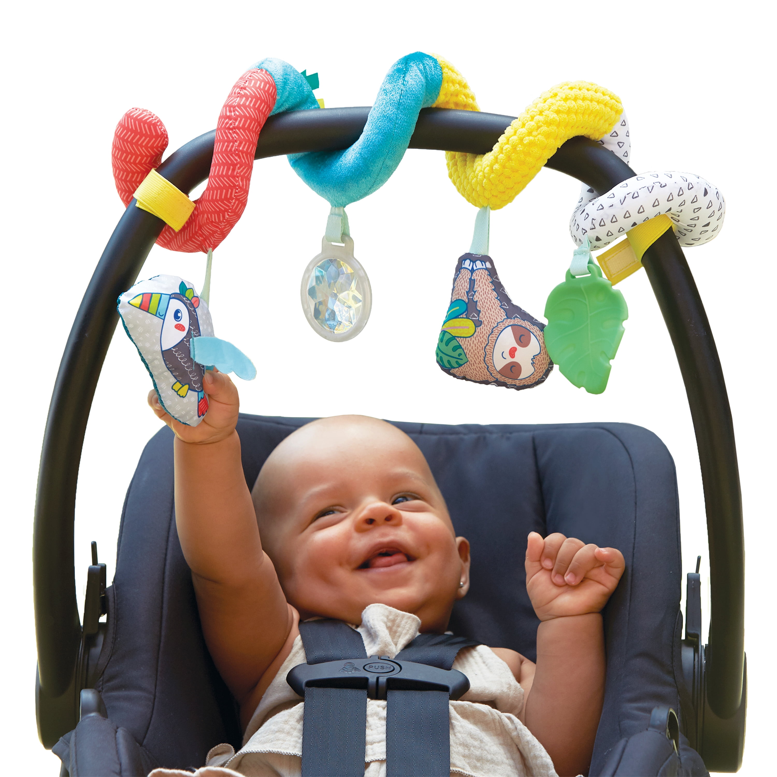 This soft activity spiral features four unique toys. Wraps around car seat handles and most strollers. Encourages reaching, grabbing and batting while keeping your little one engaged and interested.