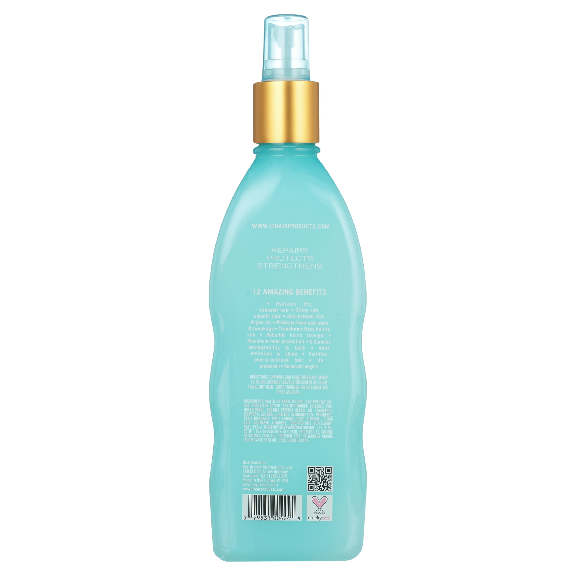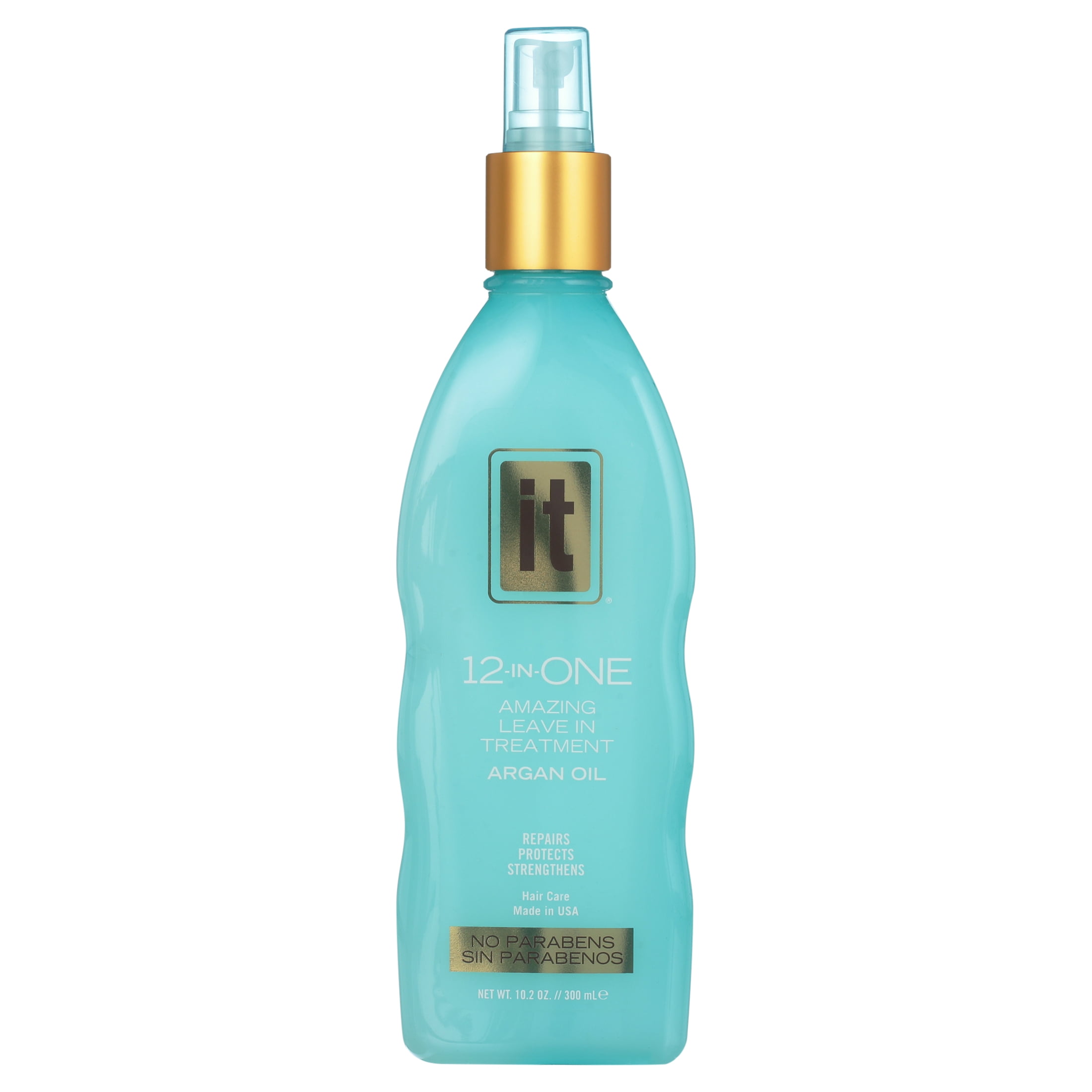 IT 12-in-One Leave In Treatment Argan Oil Spray is infused with Moroccan Argan, Abyssinian and Sunflower Oil; this incredible formula provides moisture, rebuilds, strengthens, and adds definition that doesn’t weigh hair down. Provides maximum heat protection while enhancing manageability and body while protecting from split ends and breakage. Non-greasy and paraben-free. Gentle enough for daily use and perfect for all hair types. For best results, use with IT 12-in-One Amazing Shampoo and the IT 12-in-One Amazing Hydrating Conditioner