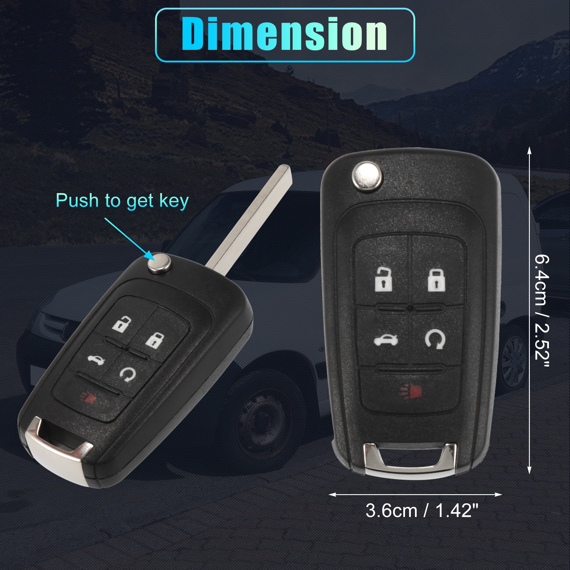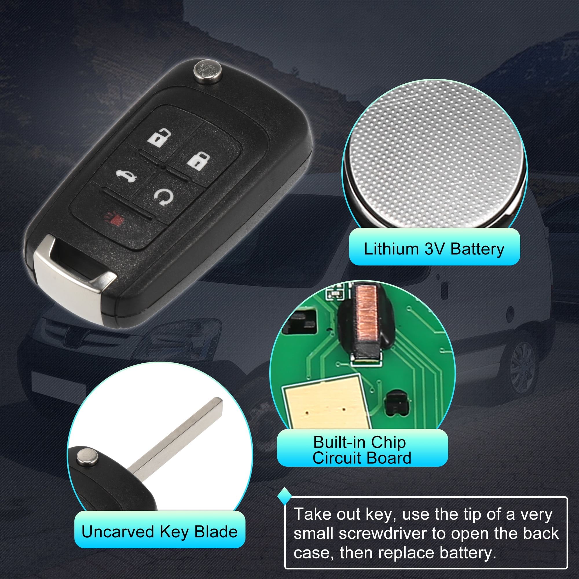 Description: Type: Keyless Entry Remote Part Numbers/FCC ID: OHT01060512, 13504199, 20979468, 13574863, 13500221, 5912545 5 Button Remote Frequency: 315MHz Chip: 46 Battery Type: Coin/Button Cell Coin/Button Cell Subtype: CR2032 Battery Material: 3V battery Material: Plastic, Metal Color: Black Size: 6.4×3.6cm / 2.52"x1.42"(L*W) With Door Key: Yes Fitment: for Chevy Camaro 2010 2011 2012 2013 2014 2015 2016 for Chevy Cruze 2011 2012 2013 2014 2015 2016 for Chevy Sonic 2012 2013 2014 2015 2016 2017 for Chevy Impala 2014 2015 2016 2017 2018 2019 for Chevy Malibu 2012 2013 2014 2015 2016 for Chevy Equinox 2010 2011 2012 2013 2014 2015 2016 2017 2018 2019 for GMC Terrain 2010 2011 2012 2013 2014 2015 2016 2017 2018 2019 for Buick Lacrosse 2010 2011 2012 2013 2014 2015 2016 for Buick Regal 2011 2012 2013 2014 2015 2016 2017Feature: This is a non-OEM product, accessory only! Please check the above part number or FCC id with the current remote. Please be sure that your vehicle is listed on the fitment. Also, Please make sure that your current key and remote as same as those pictures to insure that this replacement key fob will work for you. Programming: This remote must be programmed and cut by a qualified locksmith or dealership. Note: 1.Please make sure the remote programming can work to your vehicle before asking the locksmith to cut the key. Don’t wait for him to cut the key and discover that it does not work, which may make a loss. 2.If the locksmith declares that the key is purchased online or is not an original part, or other reasons to cause it can’t work normally, and guides you to spend more money to buy in his store, maybe he wants to make more profits. I suggest you replace other locksmiths to program. How to Replace Battery? Take out the key and use the tip of screwdriver as a tool to open the back case, replace the same battery carefully. You can use a clean cloth to clean the battery in case some dushes existed. Package Included: 1 x Car Keyless Entry Remote (Battery included)This remote must be programmed and cut by a qualified locksmith or dealership(Need to pay extra money for programming or cutting)