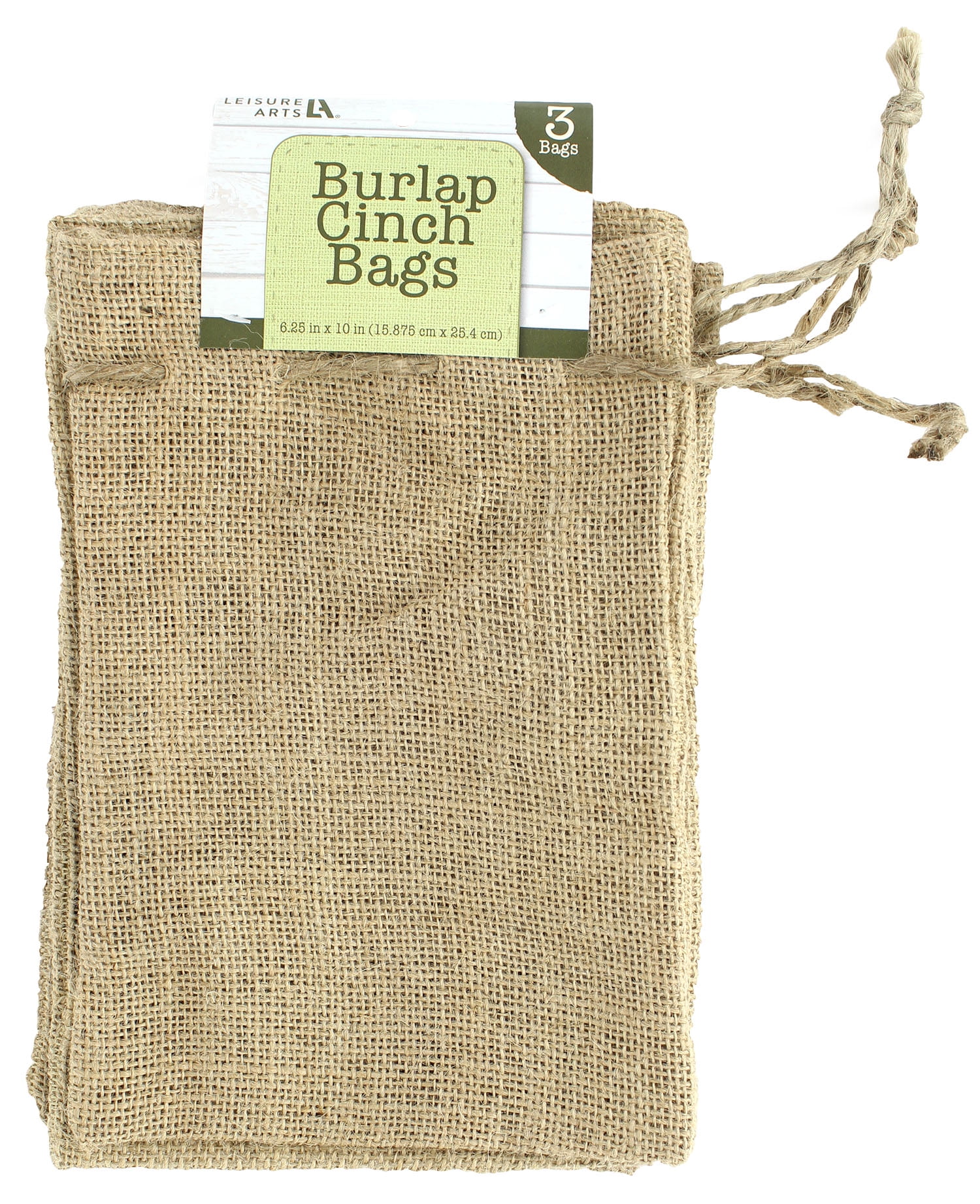 Leisure Arts Burlap Cinch Bags Natural 3pc- Natural color burlap cinch bag with jute ties. Bag measures approximately 6.25"x 10". Top edge has a hem and inside edges are finished. Perfect for gift giving. 100% jute.
