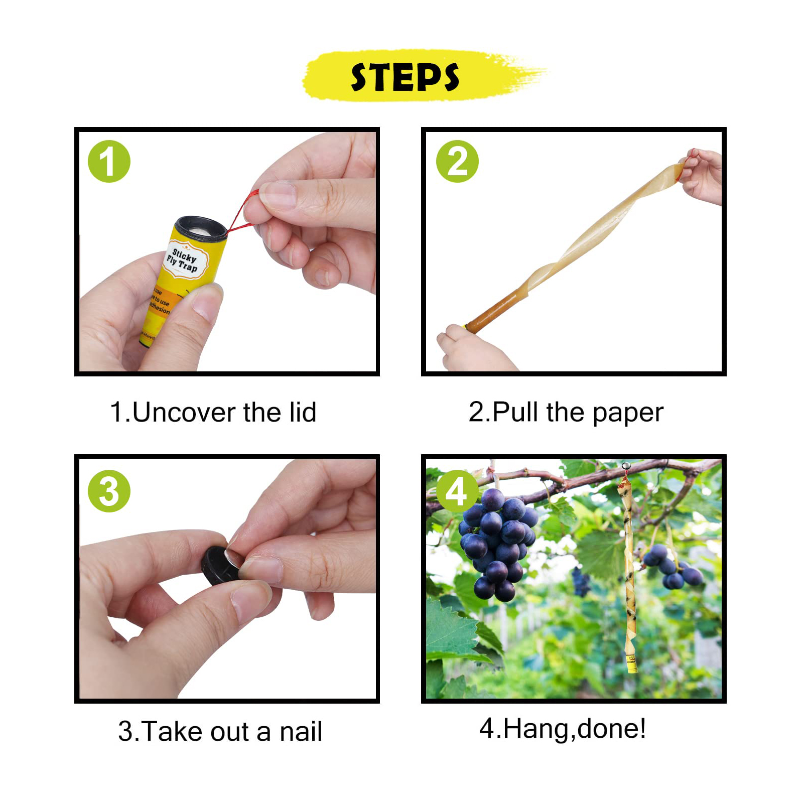 - Fly strips: hang the sticky fly strips outdoor and indoor where there are many flies, the sticky glue will stick them and keep the fly from escaping. The higher the temperature, the effect of fly tape is better.