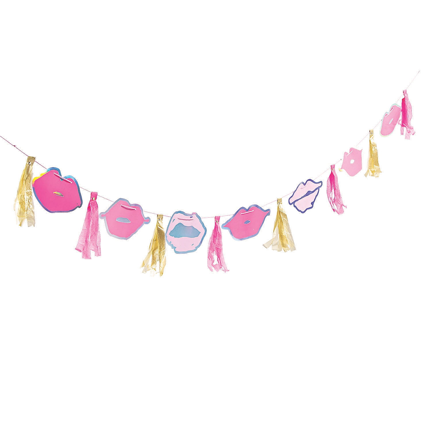 If you’re searching around for some fun bachelorette party decorations make sure you add this cute banner. Featuring various shades of pink lip cutouts the garland is accented with gold and pink tissue paper tassels for an extra touch. Find more matching bachelorette party supplies and décor throughout this site for a complete look. Cardstock and tissue paper. 6 ft. 6 1/2" with 7" cutouts.LIPS BACHELORETTE BANNER – Party Decor – 1 Piece