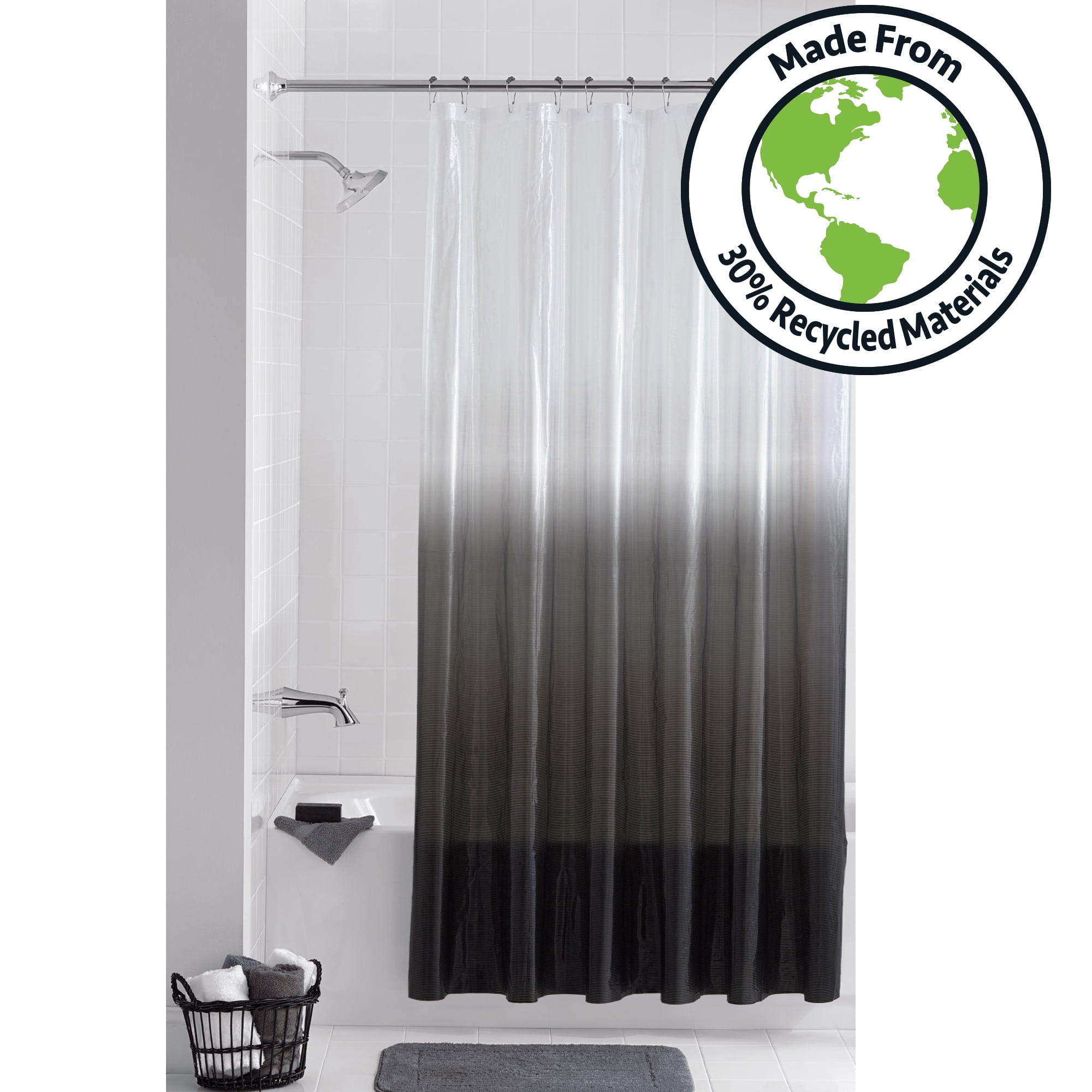Mainstays 13-Piece Twilight Eco-friendly Waterproof PEVA Shower Curtain with Hooks Set, Made from 30% Post-Consumer Recycled Materials, Black and White