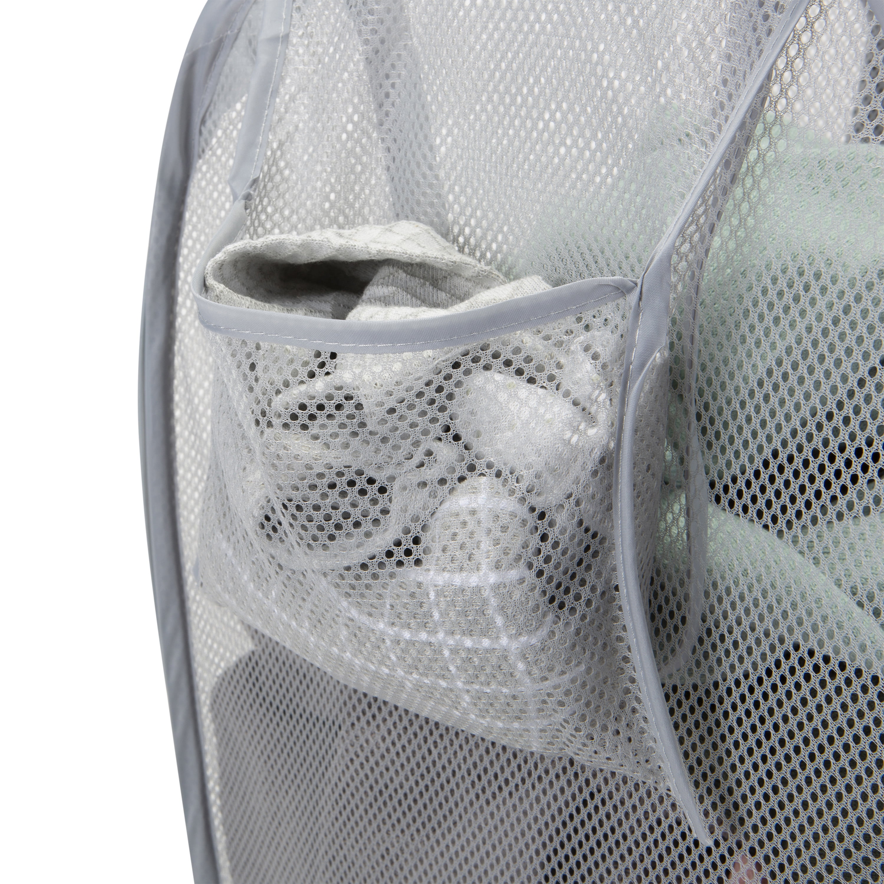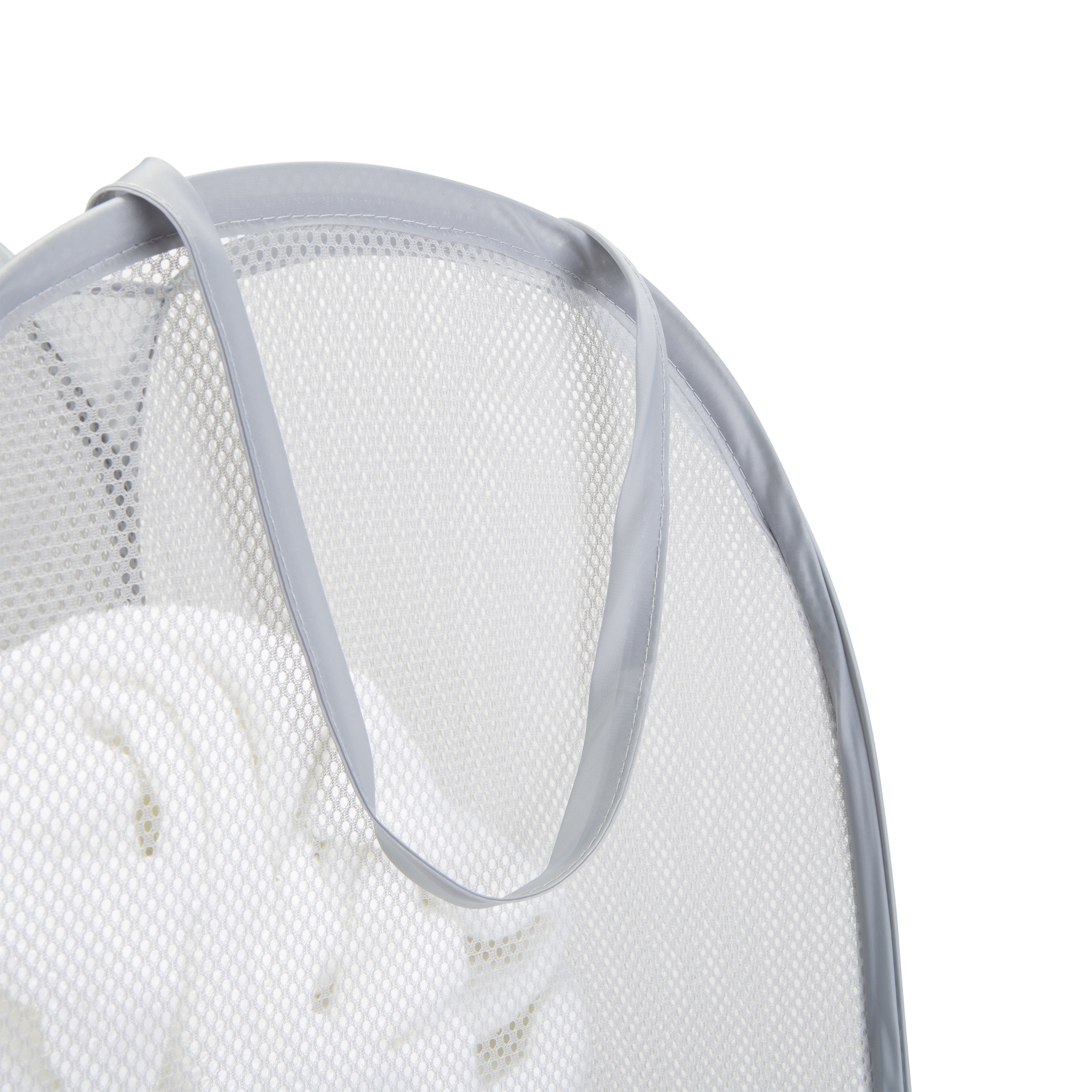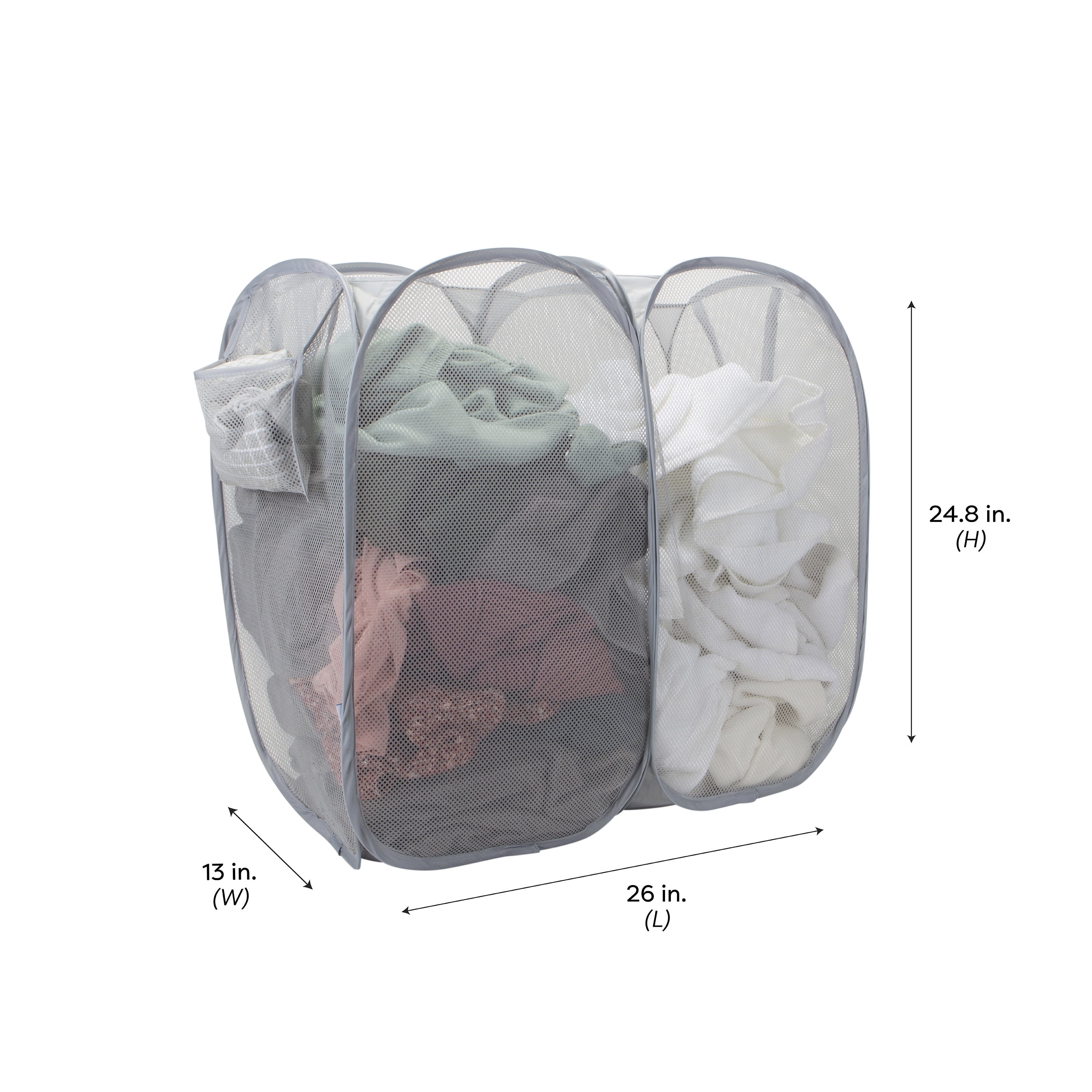 Mainstays dual pop-up hamper pops up and stays open to easily store your laundry or other soft items. The hamper holds lots of laundry and folds flat for easy storage when not in use. The hamper is made of polyester mesh and spring steel, and is great for easy sorting and storing of dirty laundry prior to laundry day. This hamper will make a great addition to any bedroom, bath, laundry room or closet space. Designed to hold dirty clothing it can also be used to store soft toys and other items. The breathable polyester mesh sides make this a great lightweight storage option.
