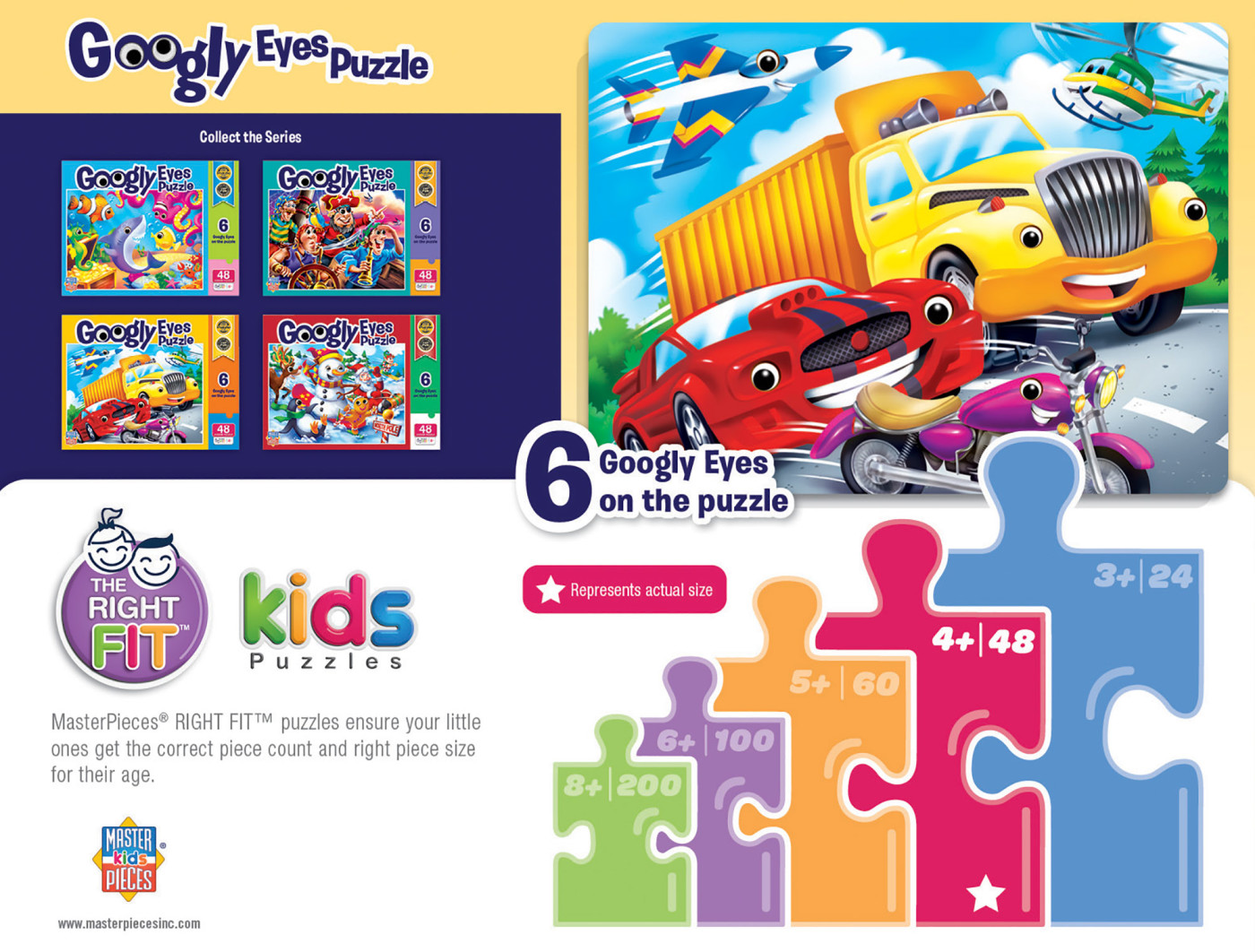 This Googly Eyes Vehicles puzzle is a great way to have even more fun with puzzles! Each puzzle comes with 8 pre-mounted, factory-secured wiggly and googly eyes, kids are sure to be entertained for hours! This puzzle is 48 pieces and 19 inches x 14 inches in size. Look for The Right Fit® puzzles collection and make sure your little one gets the correct piece count and size for a good challenge for their age. This puzzle is the right fit for ages 4+.