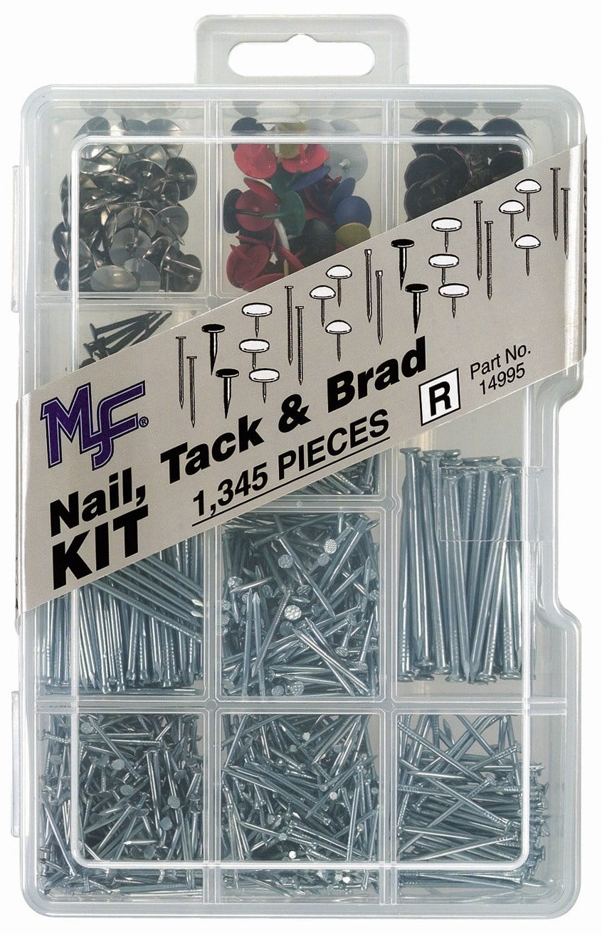 Part Number: (14995) Nail/Tack/Brad Kit from (Midwest Fastener). Durable and reusable container with multiple sized nails, tacks, and brads. Contains enough items to complete multiple projects. 1,345 pieces per kit. Technical Details: Length: 1.25 in -Height: 5.13 in -Depth: 8.5 in -Weight: 1.45 lb