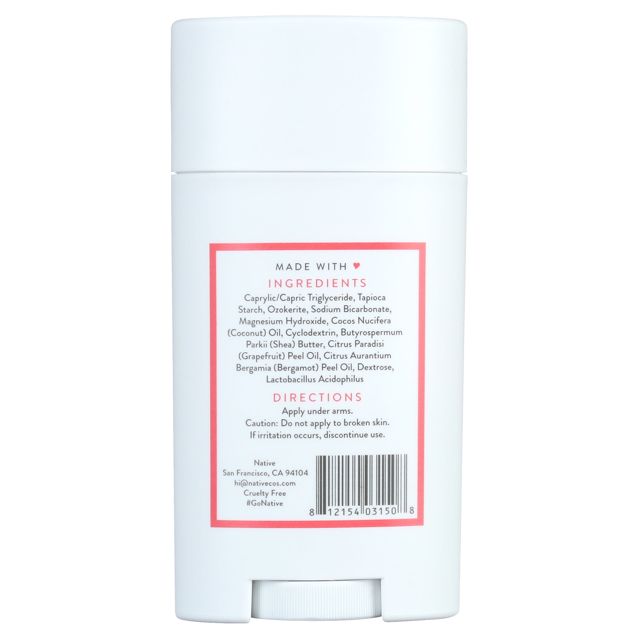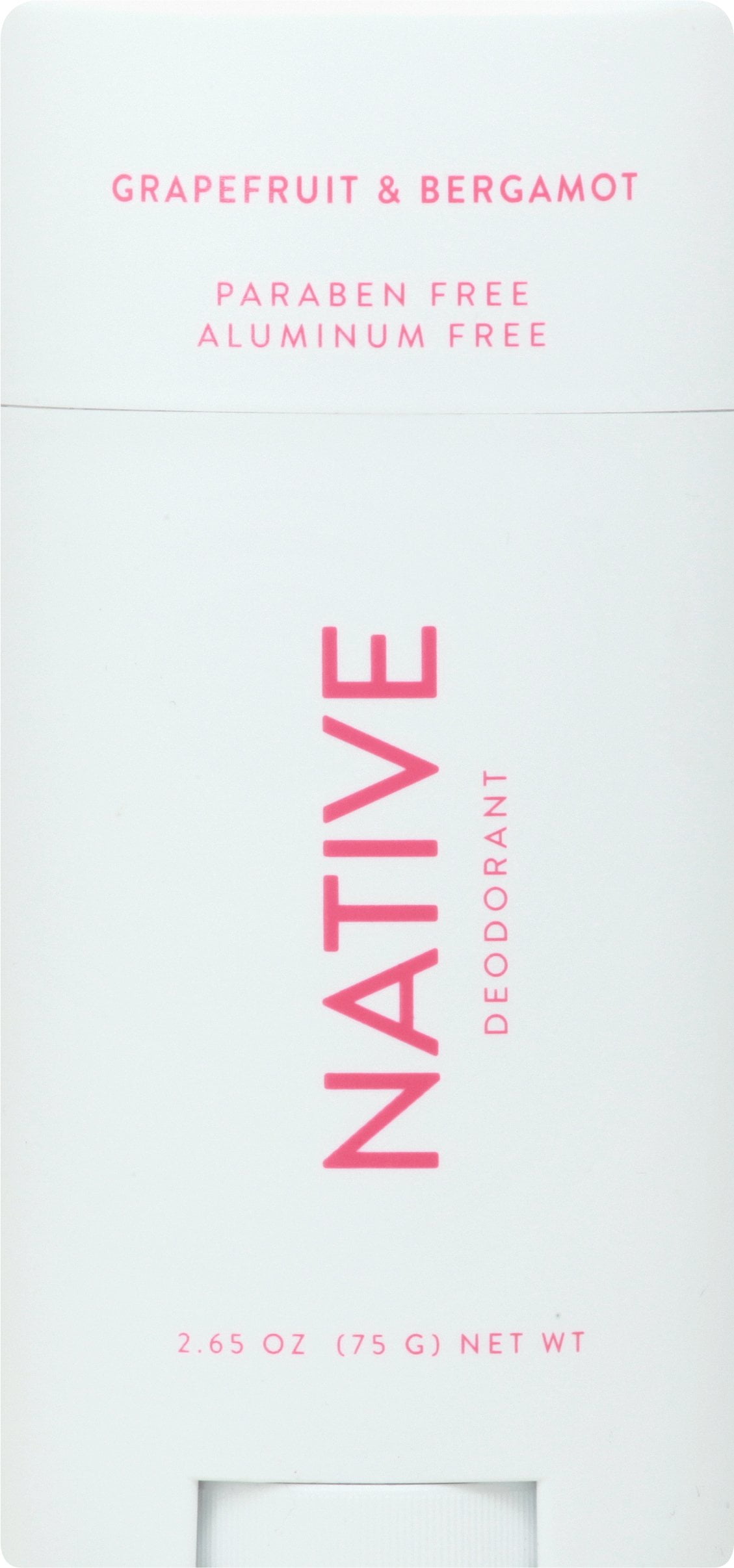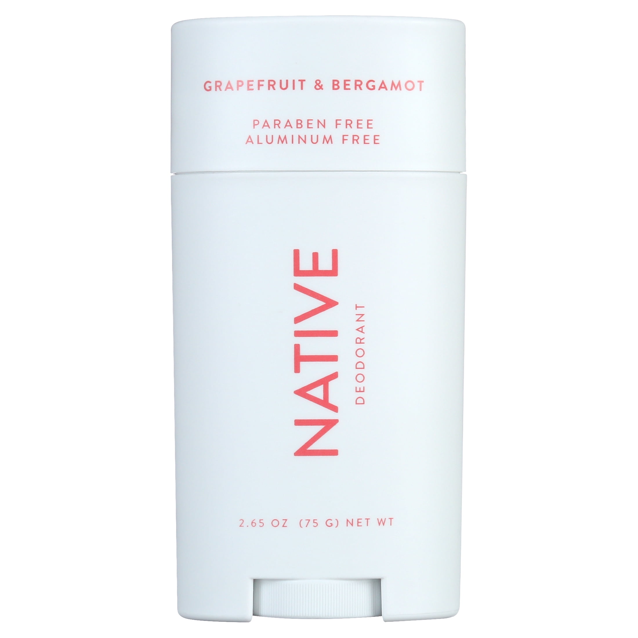 Native Grapefruit & Bergamot Deodorant2.65 oz Tube If you are planning to switch to an aluminum-free deodorant, then try Native Deodorant with over 15,000 5-Star Reviews. Native deodorant is aluminum-free and contains naturally derived ingredients, with effective long-lasting odor protection. We believe you should not have to choose between a deodorant that makes you feel safe and a deodorant that works. We never use aluminum, parabens, or sulfates in any of our products. At Native we use both safe, synthetic, sustainable fragrances (free of phthalates) and natural fragrances. Native: Safe. Simple. Effective.