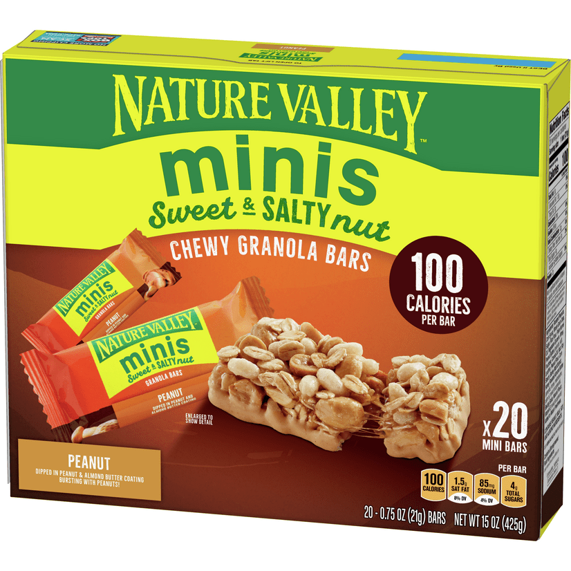 Mini sweet & salty granola bars. Dipped in a rich, creamy peanut butter coating and bursting with peanuts!