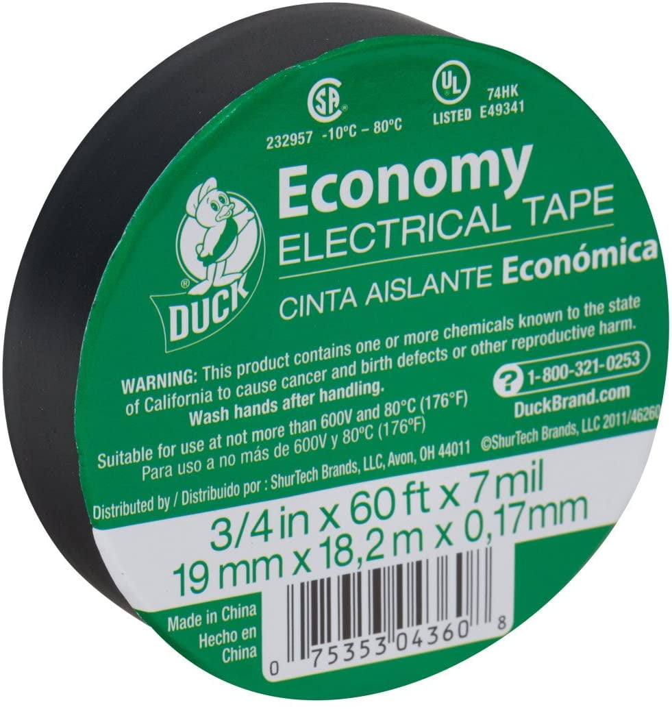 7 mil vinyl tape. Rated for use up to 600 volts and between 14-degree F and 176-degree F. Excellent stretch, adhesion and conformability. Resists abrasion, moisture and solvents. Performs well to 600V. UL listed and CSA certified. 3/4" x 60′ Flame retardant Resists abrasion, moisture & solvents Performs well to 600V 7 mil vinyl tape Rated for use up to 600 volts and between 14°F and 176°F Excellent stretch, adhesion and conformability UL listed and CSA certified Cello wrap. WARNING: This product can expose you to chemicals including Di(2-ethylhexyl)phthalate (DEHP) which is known to the State of California to cause cancer and birth defects or other reproductive harm. For more information go to www.P65Warnings.ca.govNew 1PK Duck 1219-60 Economy Electrical Tape, 3/4" x 60′, Vinyl, Each