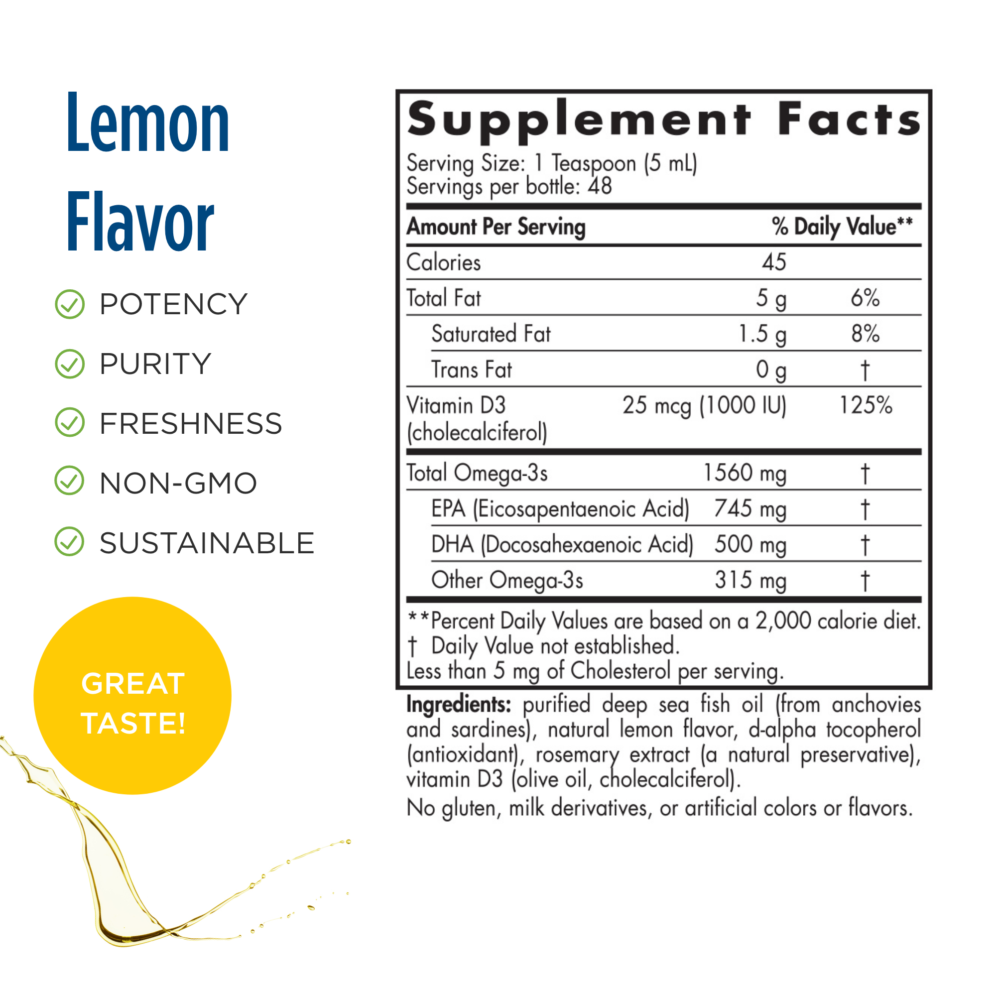 In addition to all the benefits of our Omega-3 formula, offering 1560 mg of naturally concentrated omega-3s, each serving of Omega-3D includes 1000 I.U. of vitamin D3, meeting the daily recommendation for children and adults who do not receive adequate sun exposure. Vitamin D3 is the natural form of vitamin D produced by the body, and is better absorbed and utilized than other forms. This powerful formula offers combined support for a healthy heart and brain, bones, mood, and immunity.*