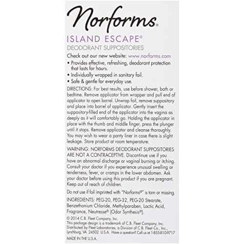 For the most up to date information, we recommend you visit the manufacturer website for the best product details, including ingredients, hazards, directions and warnings. This product offering is for 3 Retail PackageNorforms Feminine Deodorant Suppositories | Long Lasting Odor Control | Island Escape | 12 Count | Pack of 3