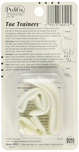 Warnings: If you have diabetes or poor circulation, consult your physician before using. If numbness, discoloration, irritation or additional toe pain occurs, discontinue use immediately. Do not overtighten. If symptoms persist, visit a foot specialistToe Trainers ease pain by straightening and separating crooked, overlapping, or hammer toes.