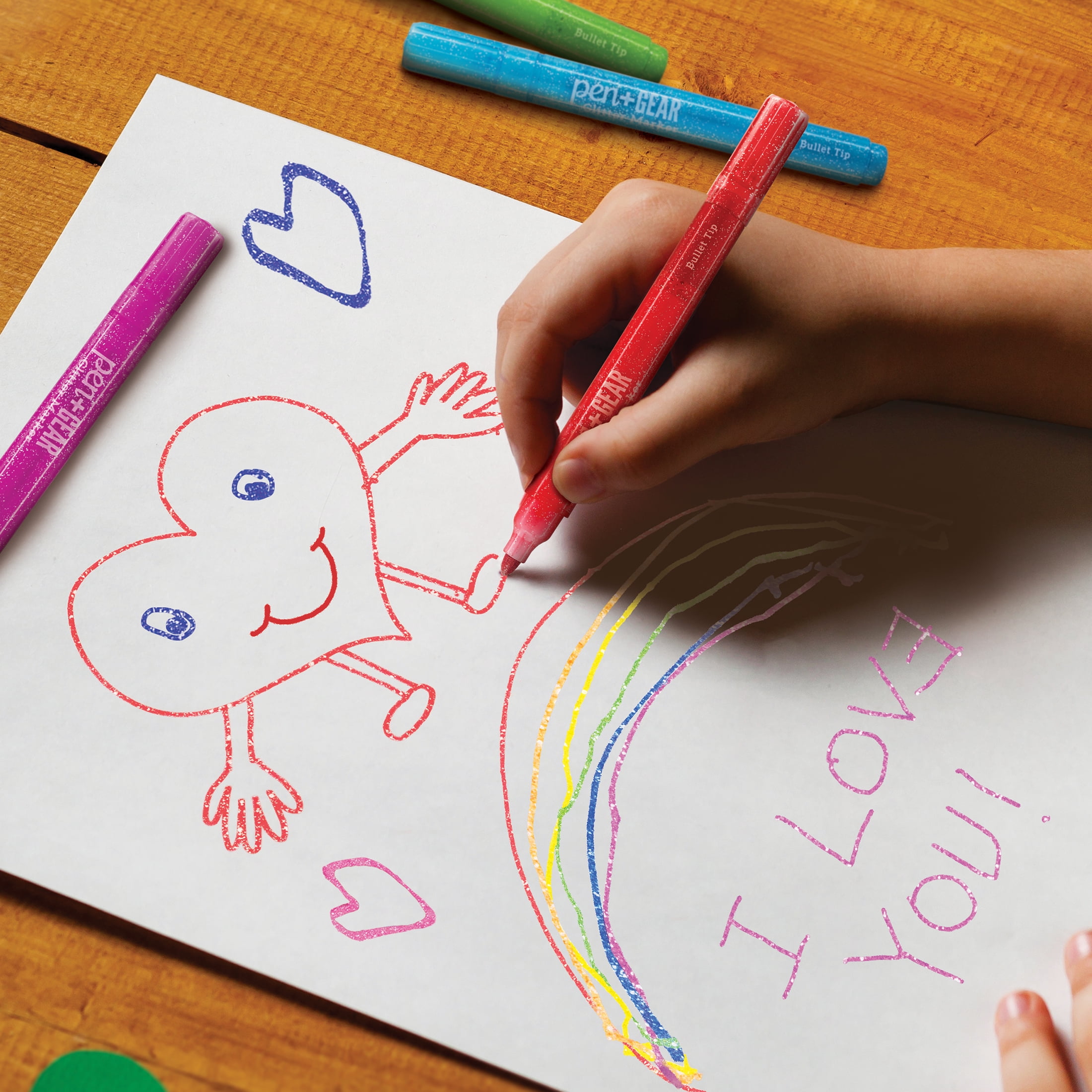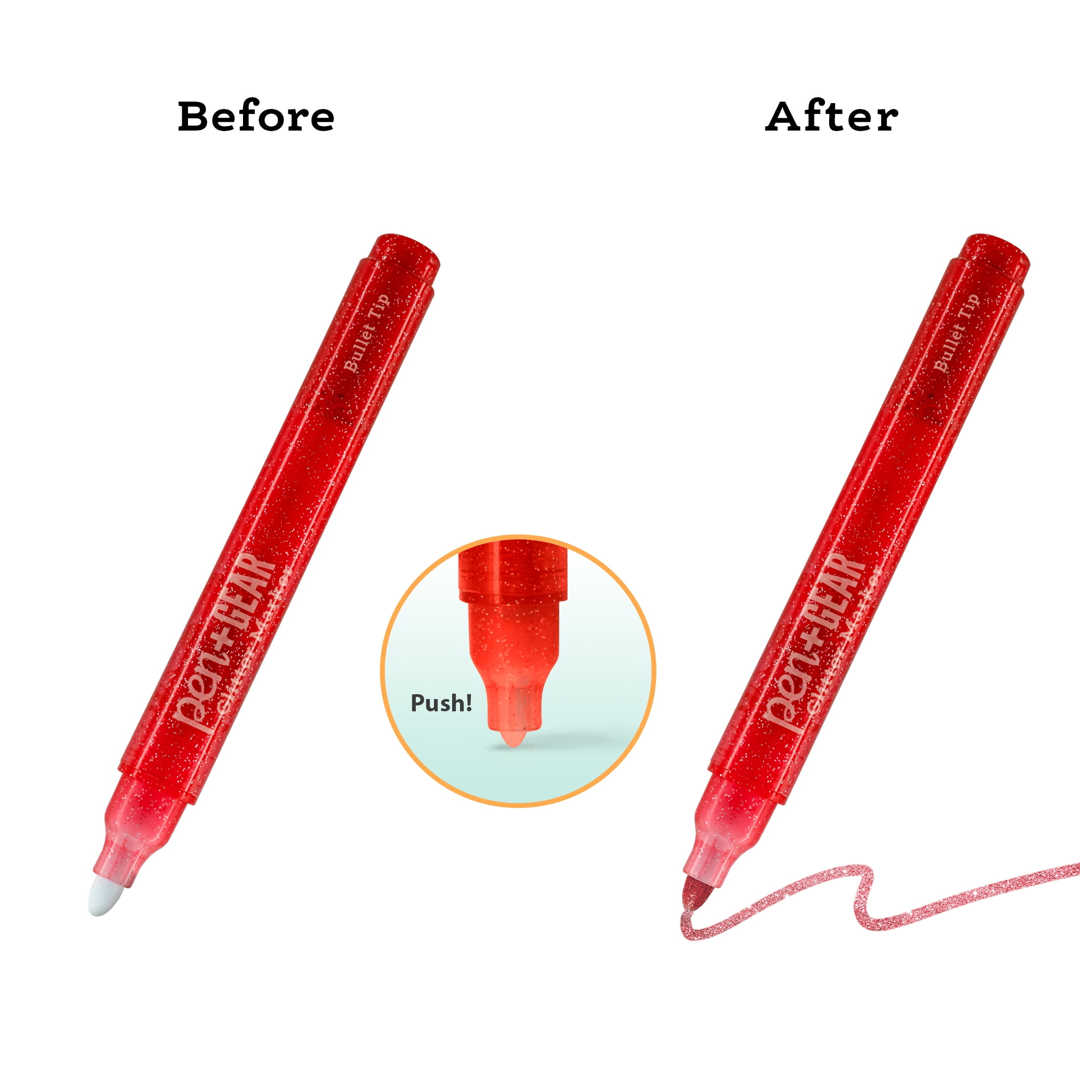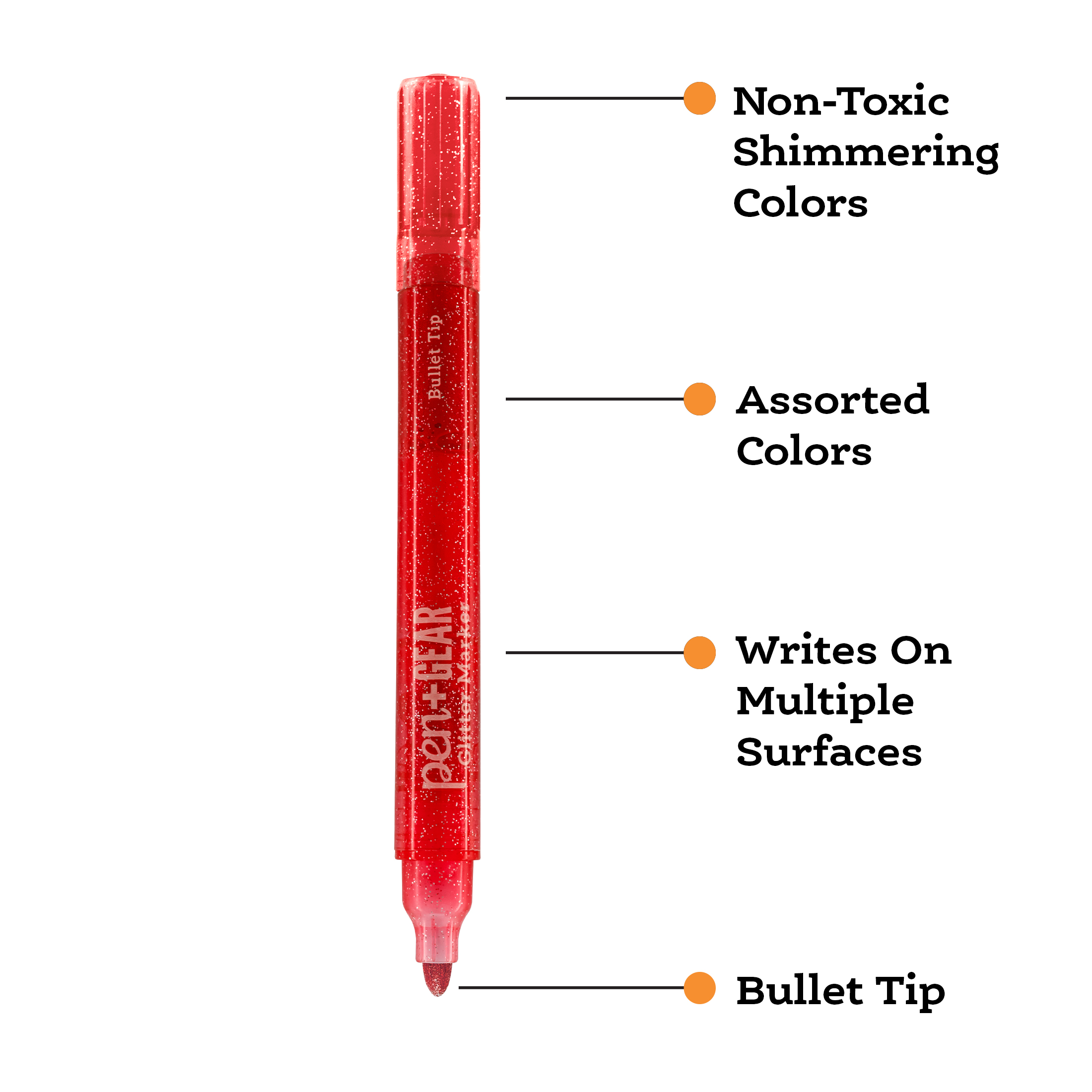 Pen + Gear Glitter Markers, 24 Count will add an extra dazzling touch to homemade cards, crafts, colorful art projects, and any writing project. The bullet point markers deliver bright shimmering glitter ink. Our markers are nontoxic with a handy snap-on cap to keep your markers fresh. You can use them at home, in school, or anywhere you need some color. Check out other Pen + Gear other office and school essentials at Walmart.com