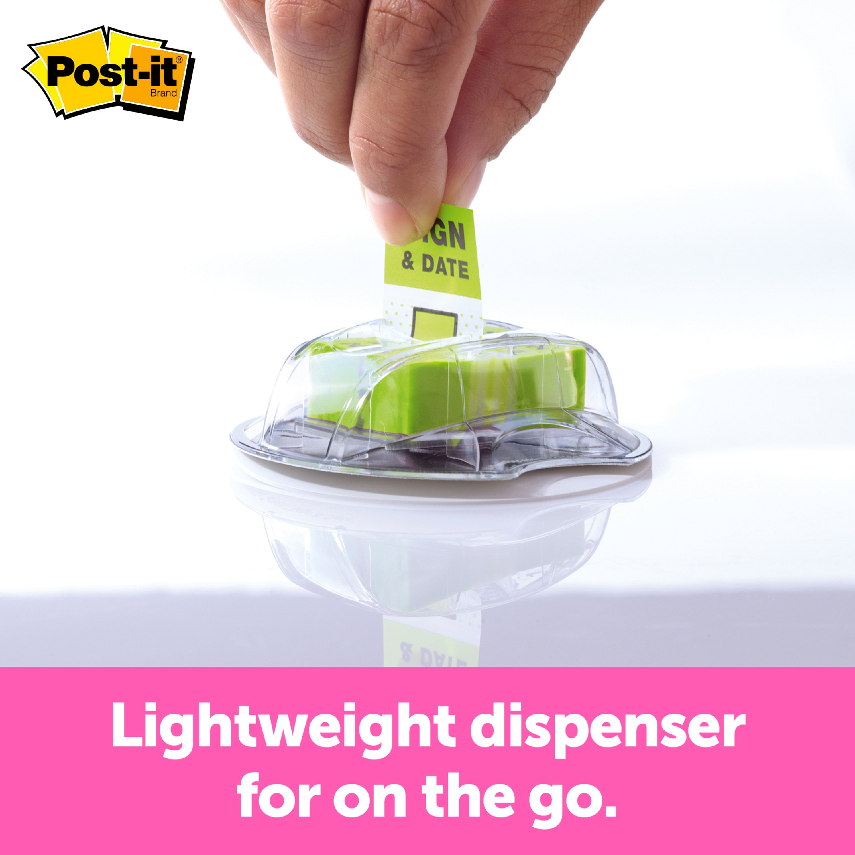 Find it fast with Post it Sign and Date Message Flags in an eye-catching bright green color that gets noticed. They make it simple to mark or highlight important information within documents and files that require signatures. They stick securely, remove cleanly as needed. Draw focus to critical items that need attention. Handy desk grip dispenser keeps them ready for use at work, home or in the classroom. This pack contains 1 in. wide, 200 per Desk Grip Dispenser, 1 Dispenser/Pack.