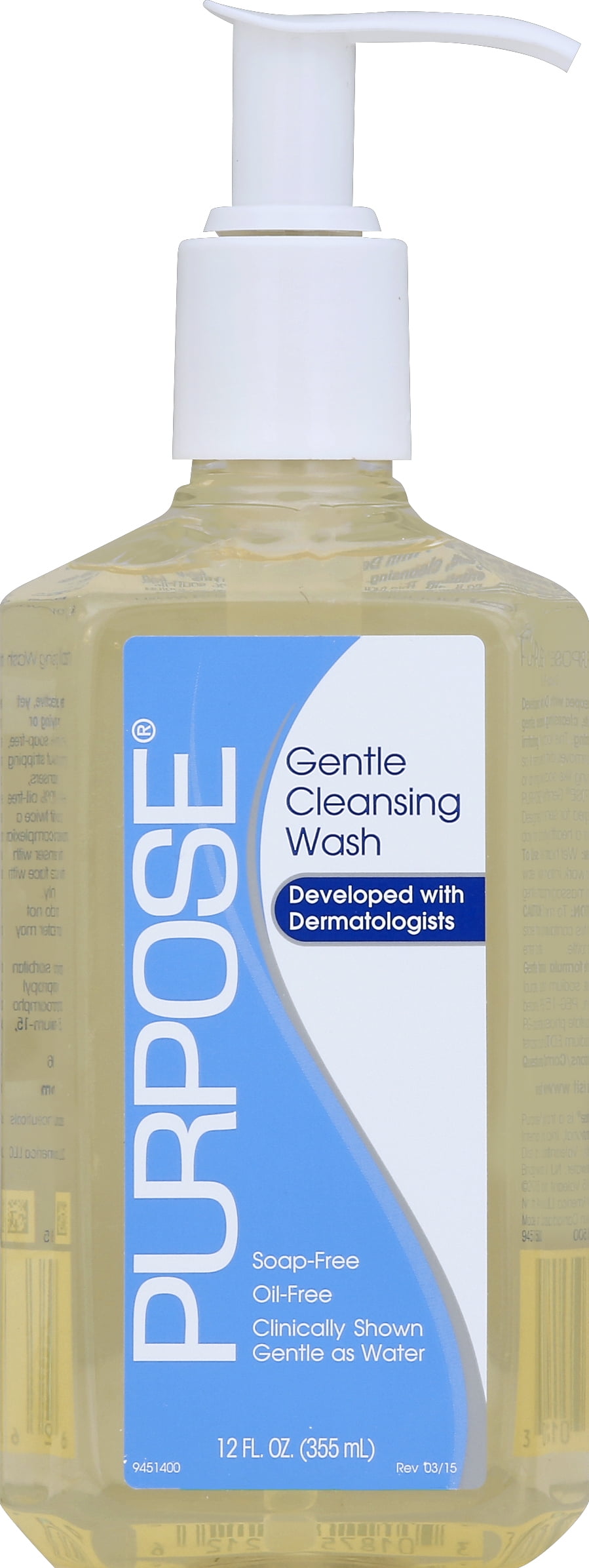Cleansing Wash, Gentle, Bottle 12 OZ Soap-free. Hypoallergenic. Won’t clog pores. Dermatologist recommended. Clinically shown gentle as water. Dermatologist recommended for effective yet gentle cleansing. Cleanses without drying or irritating. This foaming cleanser is 100% soap-free, so it removes dirt, oil and makeup without stripping or drying like soap can. And it won’t sting your eyes, so it’s ideal for removing eye makeup. It won’t clog pores. Unlike some cleansers, Purpose Gentle Cleansing Wash is 100% oil-free and non-comedogenic, so it won’t clog pores or leave residue. Even those with sensitive skin can use it twice a day for a healthy looking, healthy feeling complexion. Questions/Comments? 1-800-321-4576. Visit www.purposeskincare.com. Made in Canada.