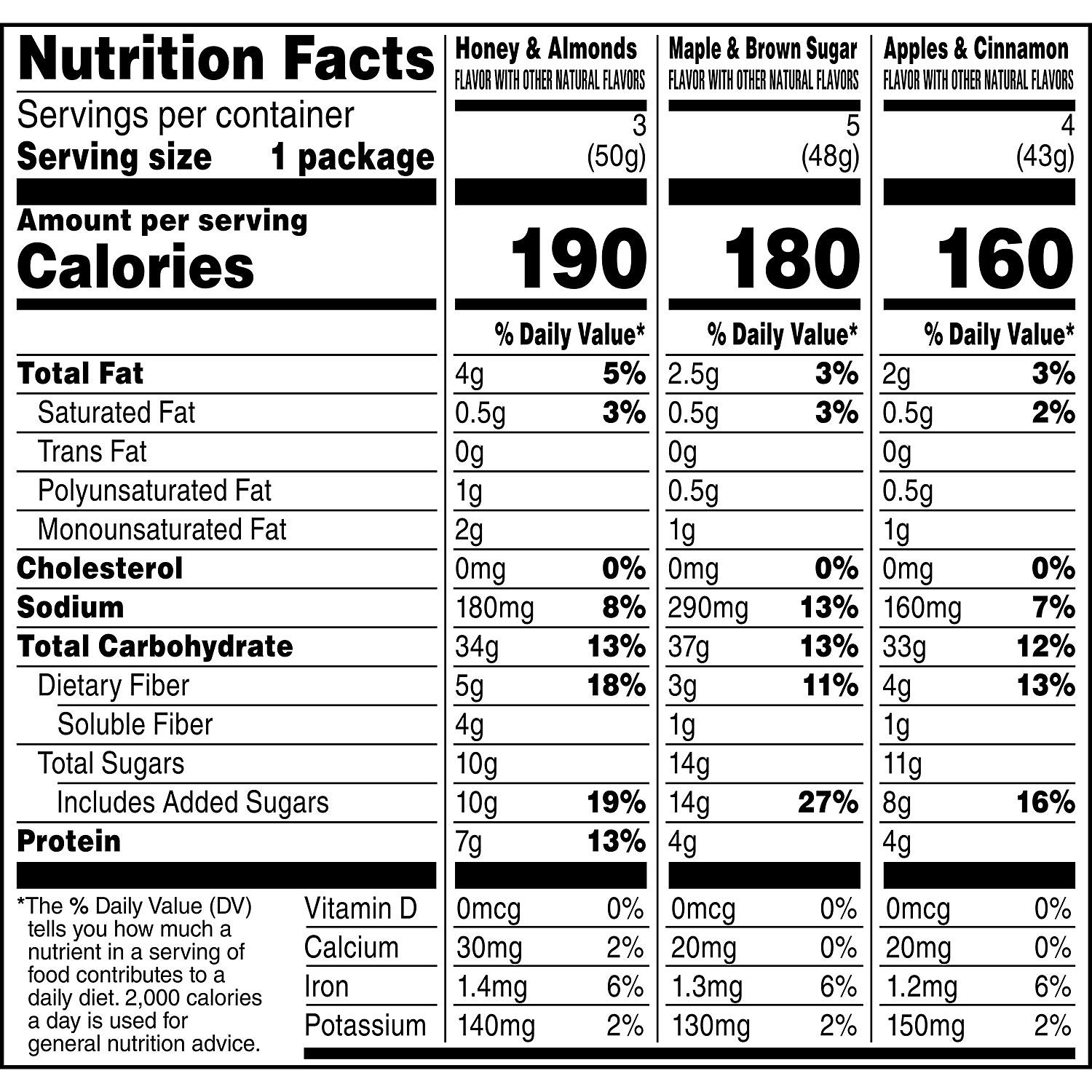 - Three flavors: Maple & Brown Sugar, Apples & Cinnamon, and Honey & Almonds