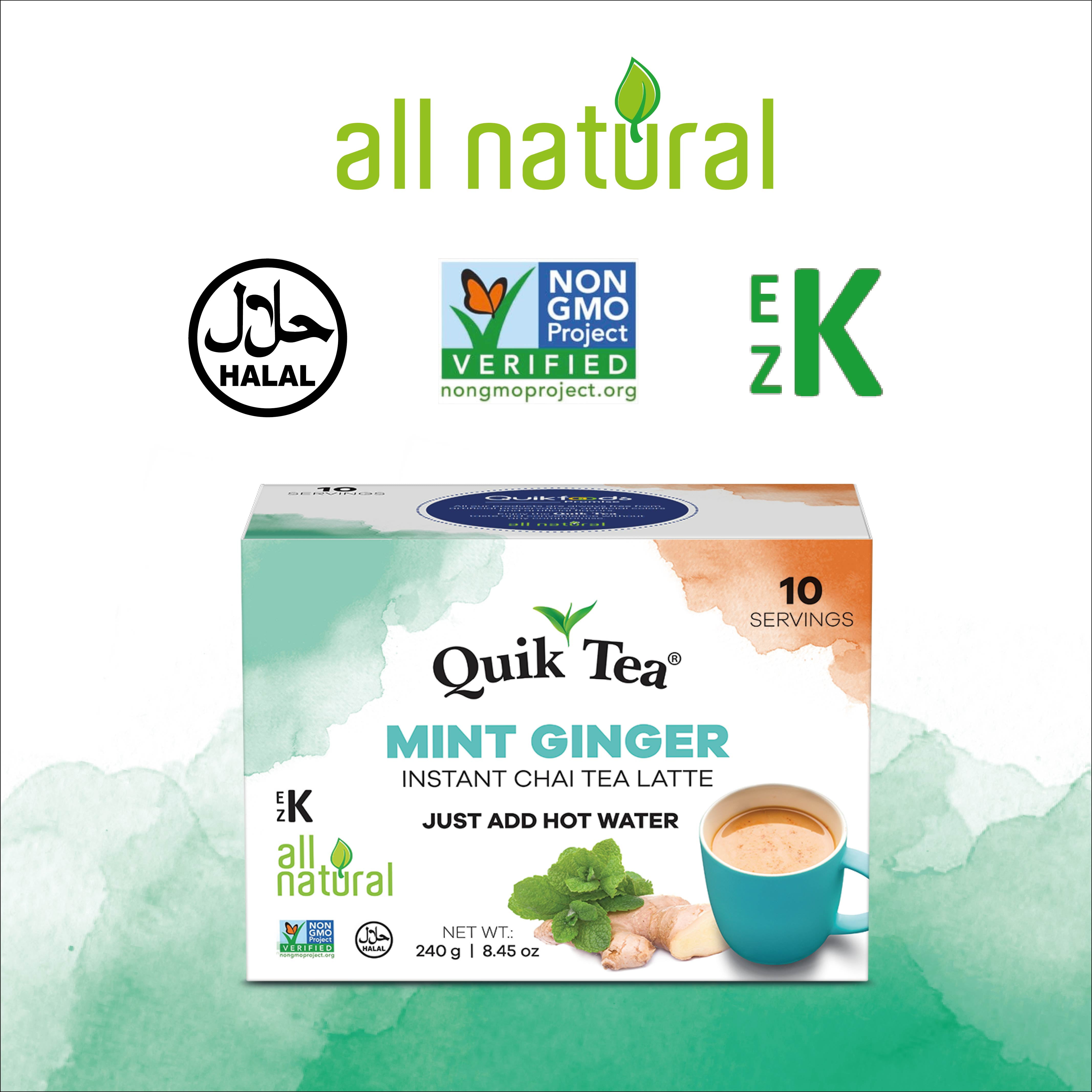 QuikTea Mint-Ginger Chai is a refreshing cup of tea and has all the health benefits of Mint with the great flavor of Ginger. Clean your breath and revive your taste buds!! Features All Natural No Preservatives No GMO