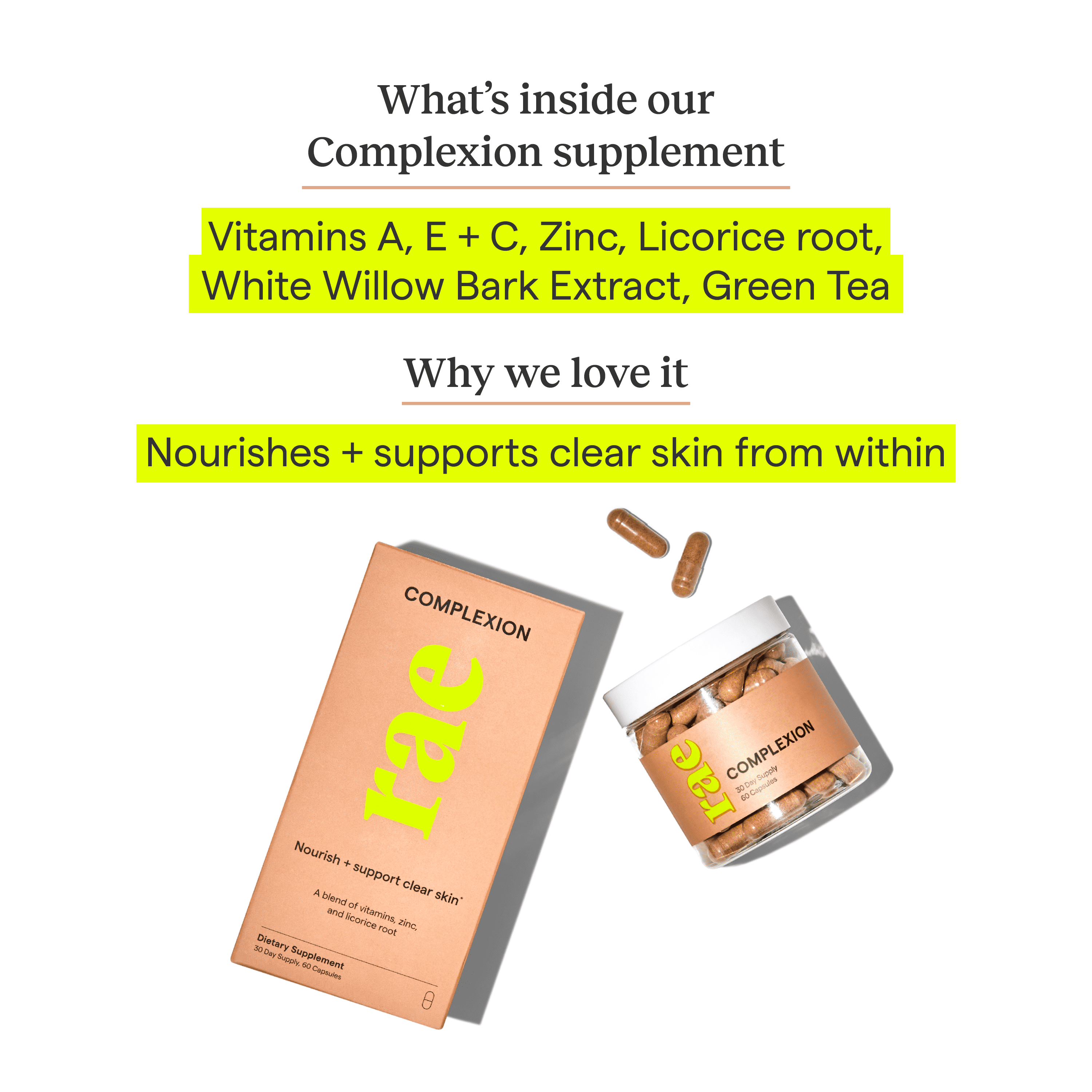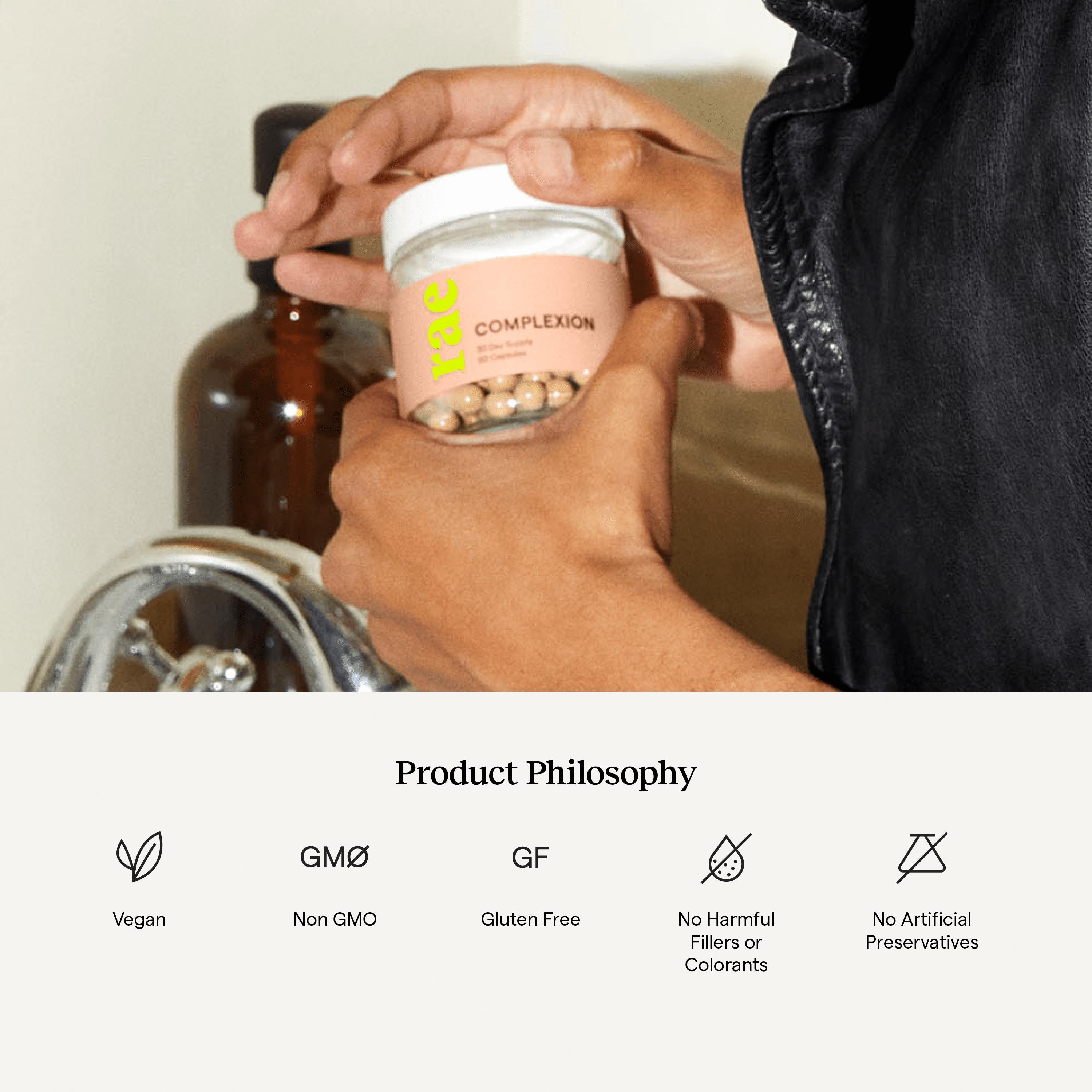 - Support overall well-being. Rae’s vitamins are formulated with ingredients that are gluten free, non-GMO and free of harmful fillers, colorants and artificial preservatives. Presented in a reusable and recyclable jar alongside a mint tab for freshness, our Complexion Capsules are made with you in mind to help elevate your daily wellness routine.