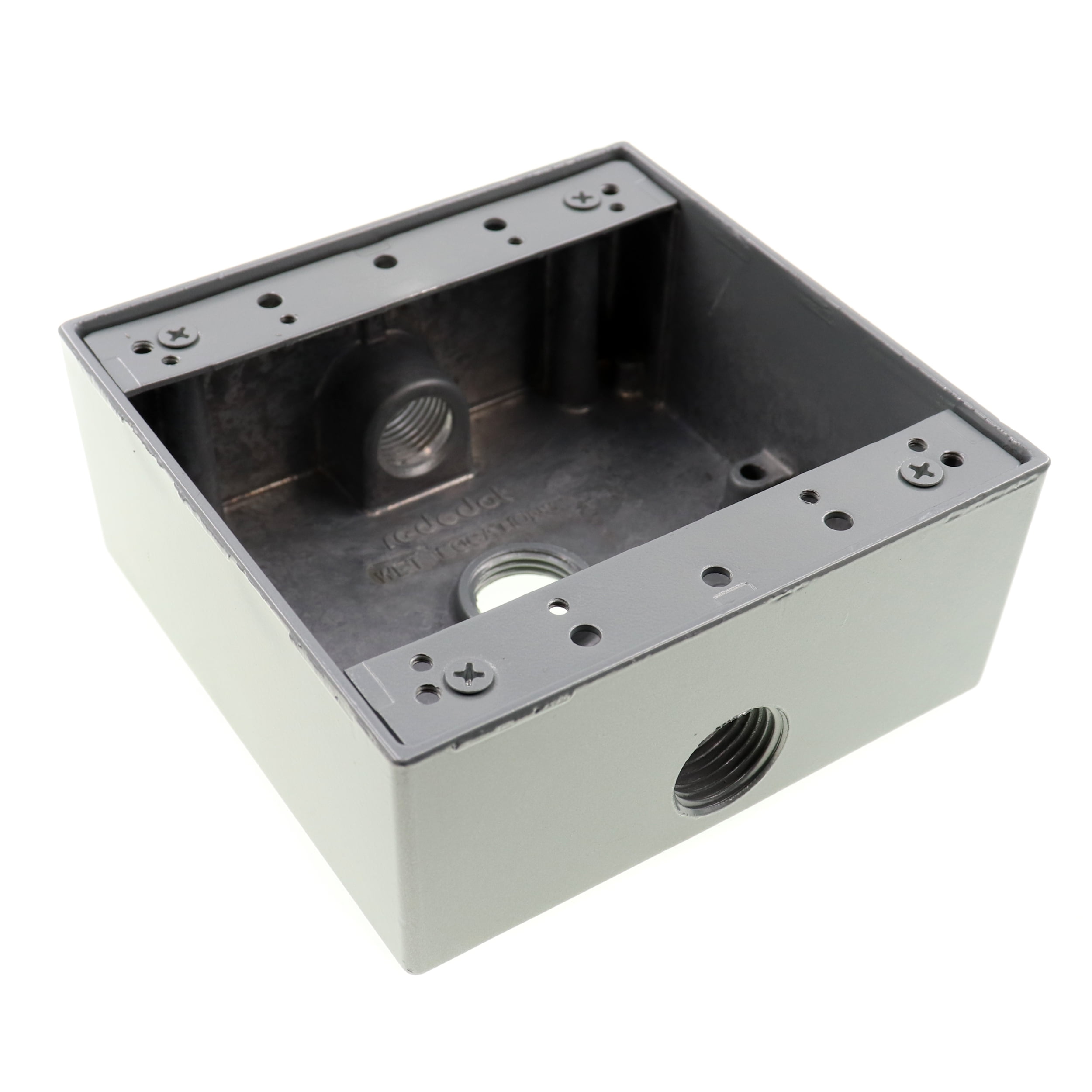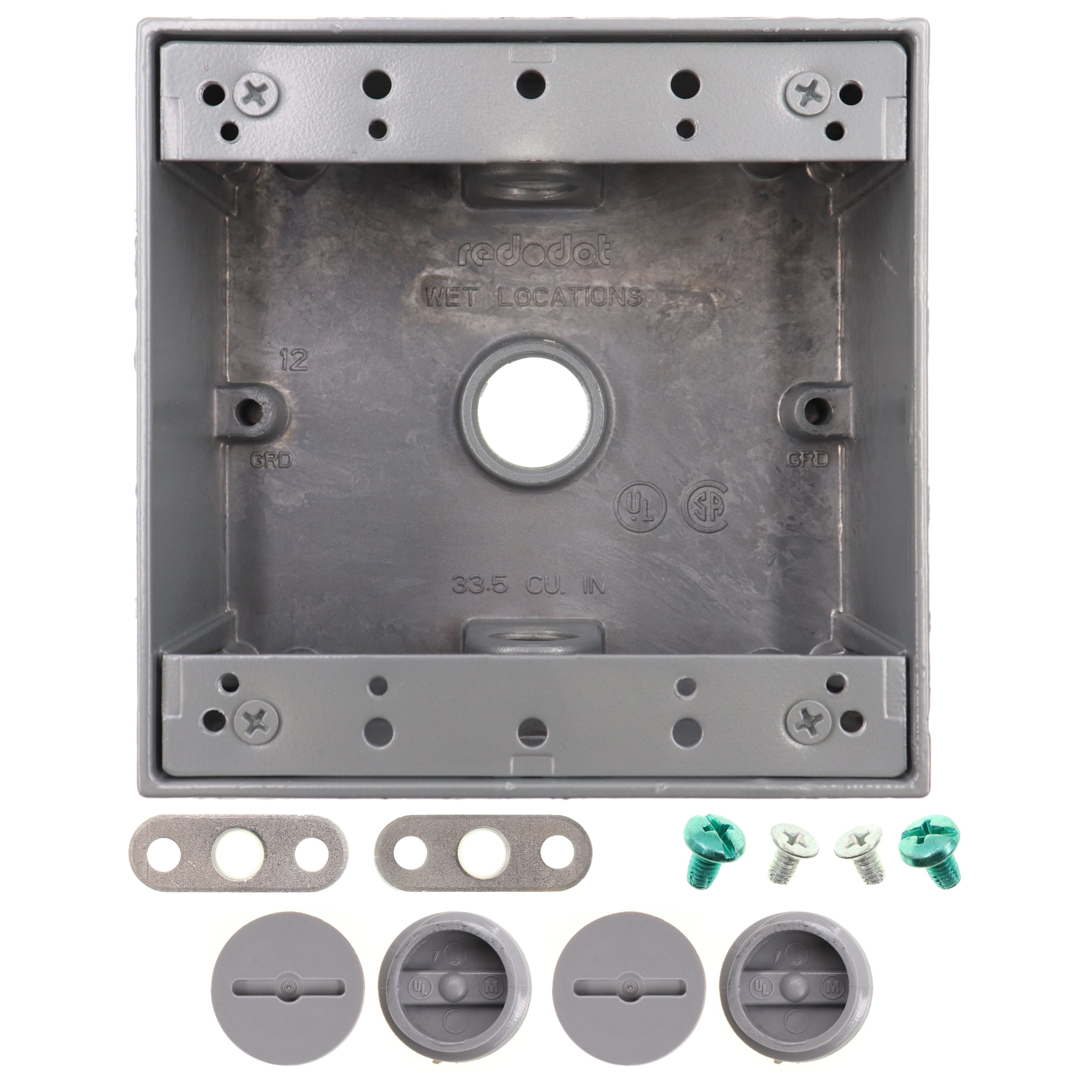 This Red Dot 2-gang weatherproof electrical box is designed for use in branch circuit wiring in wet, damp, or dry locations. It is constructed from die-cast aluminum alloy.Highlights:Color: SilverMade from durable die-cast aluminumProvides 3-holes for branch conduit connections1/2 box extensionProtects electrical wiring from impact and moistureServes as a junction box for branch conduitPrecision cast and machined surfaces permit safe wire pullingQuality weatherproof construction to withstand the harshest elements and ensure trouble-free installation and performance