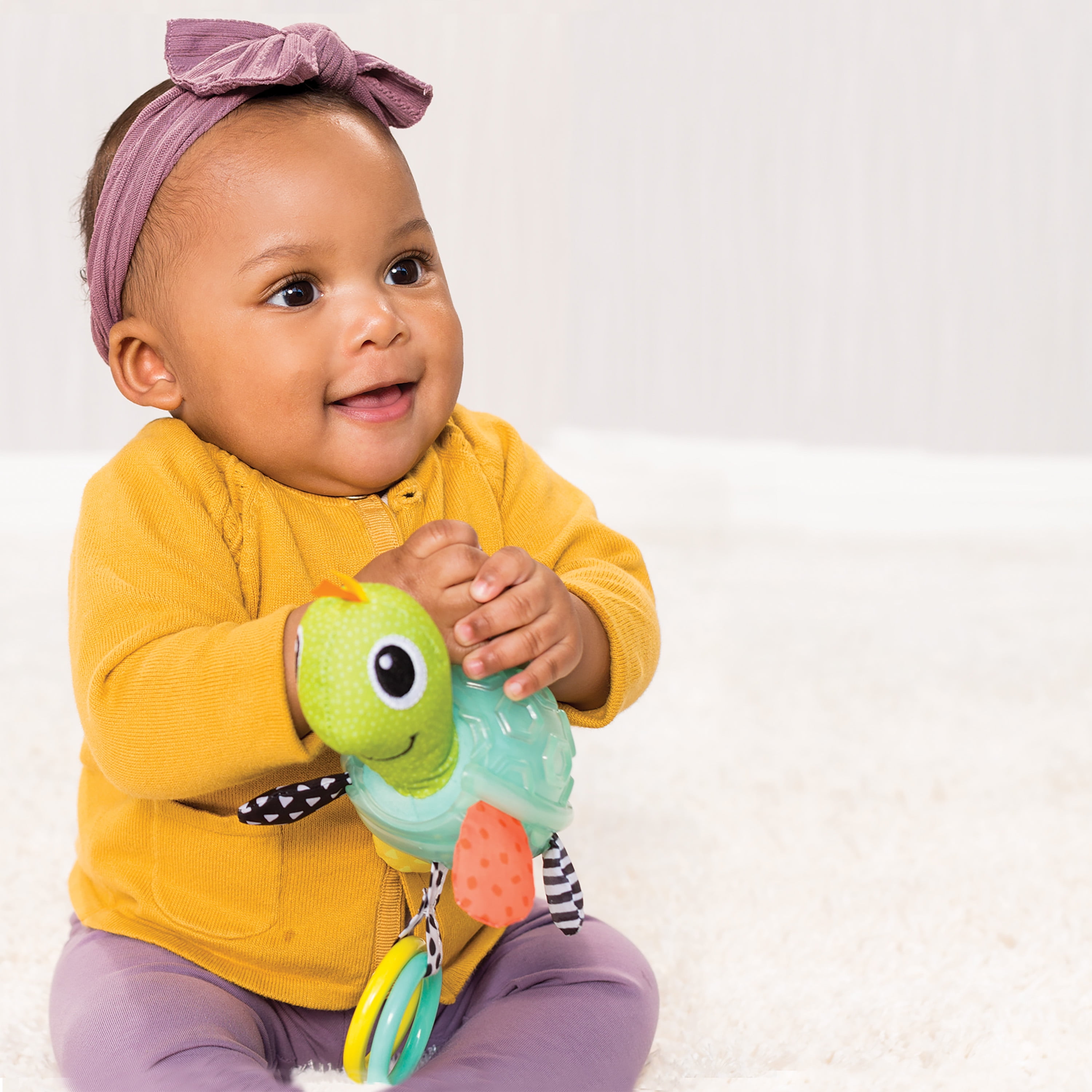 - Encourages baby to reach, tug, and bat, strengthening hand-eye coordination; outer ring bead chase has squishy textured beads to move and explore