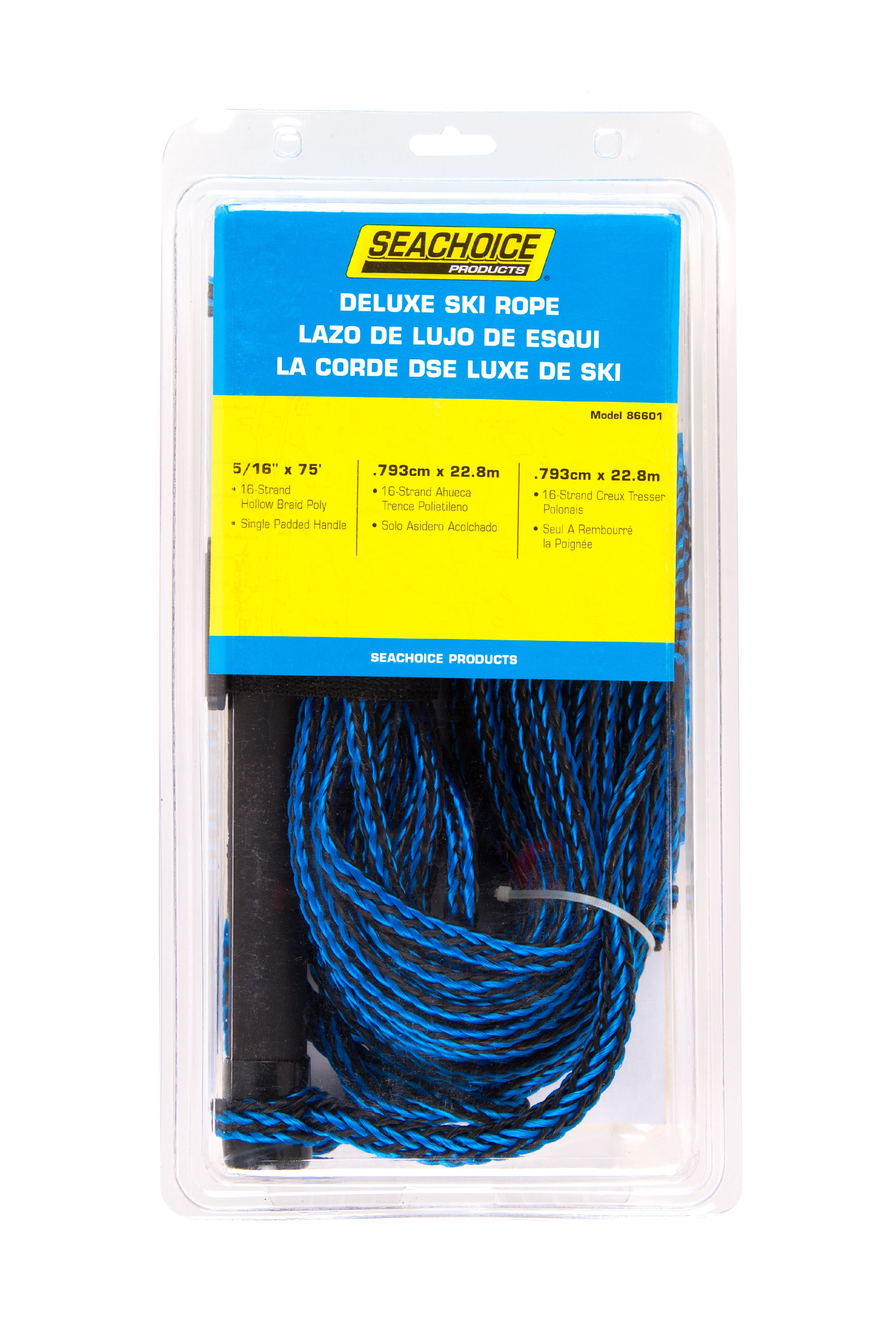 This 75-foot-long deluxe water ski rope is constructed of durable 16-strand hollow braid polypropylene and features a 12-inch handle with foam grip for a comfortable and secure hold. Brightly colored design is easily visible. The spliced end loop allows for easy attachment to an elevated ski pylon, tow eye or Seachoice tow harness.Seachoice is committed to delivering quality marine accessories and OEM replacement parts to satisfy fishing, boating and watersports enthusiasts worldwide. Seachoice is run for and by boaters, offering a wide-ranging product line while remaining affordable.