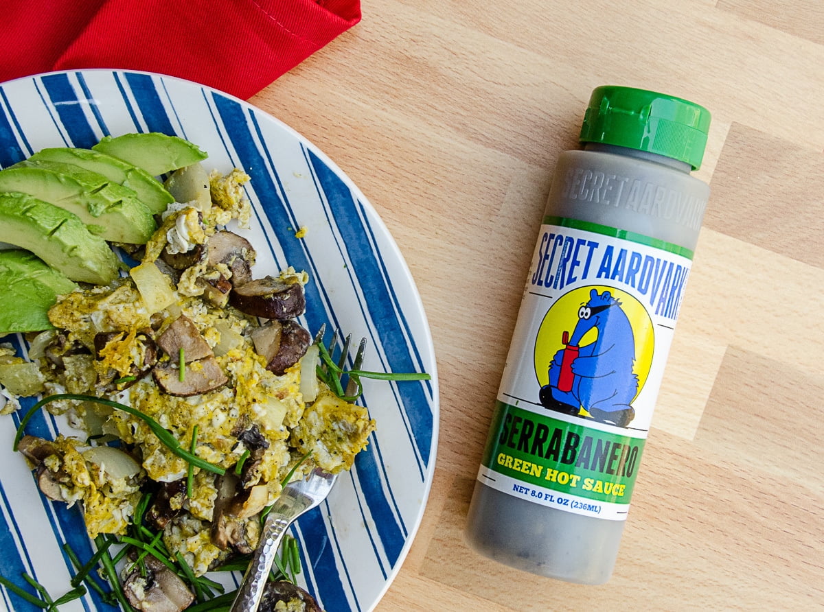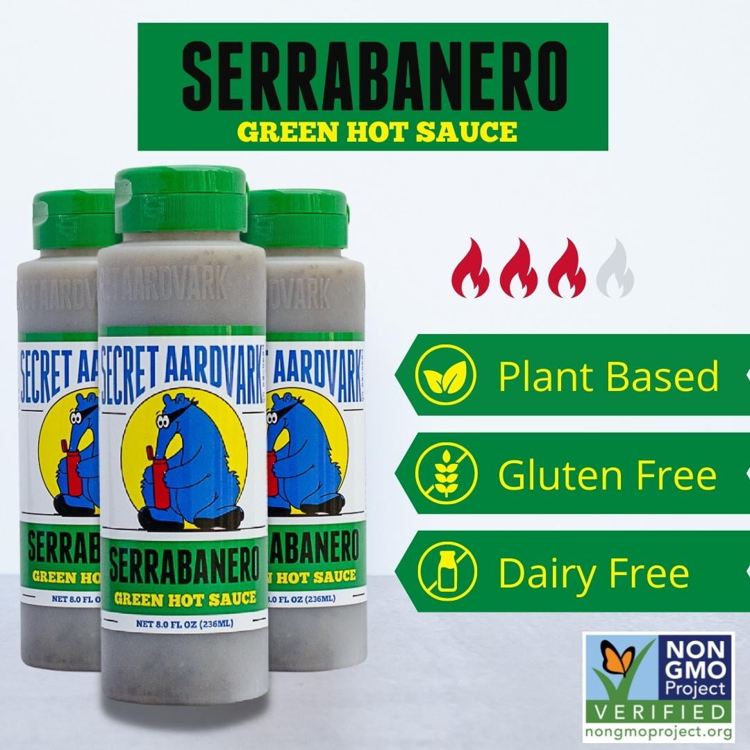 Secret Aardvark Serrabanero Green Hot Sauce 8 Oz. Serrabanero Green Hot Sauce combines serrano and habanero chili with tomatillos, green tomatoes and spices to get the mythical flavor of Serrabanero. It is a tad spicier that you might expect for a green hot sauce but not at the expense of flavor!